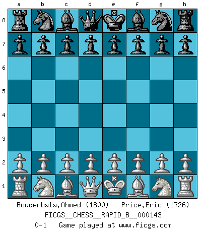 Last move : 0-1 2010 March 25 9:30:13 [Event "FICGS__CHESS__RAPID_B__000143"] [Site "FICGS"] [Date "2010.02.23"] [Round "1"] [White "Bouderbala,Ahmed"] [Black "Price,Eric"] [Result "0-1"] [WhiteElo "1800"] [BlackElo "1726"] 0-1 This chess game has been lost on time (started : 2010.02.23 1:27:42) Player Black won this chess game. Follow this game move after move (download)You need not play well - just help your opponent to play badly. (Genrikh Chepukaitis) Ich habe kein Problem mit Frauen, sondern nur mit dem Niveau ihres Schachspiels (Judith Polgar) El Ajedrez es una guerra en un tablero. El objetivo es aplastar la mente del oponente. (Bobby Fischer) Ce qui caractérise les parties de combat, c'est que si le défenseur a constamment de difficiles problèmes à résoudre, l'attaquant doit chercher sans relâche de nouvelles possibilités d'attaque. (Koblentz) History is a gallery of pictures in which there are few originals and many copies. (Alexis de Tocqueville)
