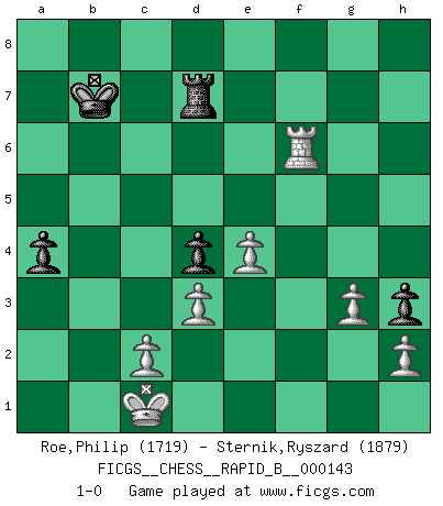 Last move : 1-0 2010 March 25 21:1:45 [Event "FICGS__CHESS__RAPID_B__000143"] [Site "FICGS"] [Date "2010.02.23"] [Round "1"] [White "Roe,Philip"] [Black "Sternik,Ryszard"] [Result "1-0"] [WhiteElo "1719"] [BlackElo "1879"] 1.Nc3 c5 2.Nf3 d5 3.e4 d4 4.Ne2 Nc6 5.Ng3 h5 6.Bb5 h4 7.Ne2 h3 8.g3 Qc7 9.Bxc6+ Qxc6 10.d3 Qf6 11.Nd2 Bg4 12.O-O O-O-O 13.f3 Bd7 14.b4 e5 15.f4 Bg4 16.bxc5 Bxc5 17.Nb3 Bb6 18.fxe5 Qxe5 19.Rxf7 Ne7 20.Bf4 Qe6 21.Rxg7 Ng6 22.Bg5 Rdf8 23.Qe1 Ne5 24.Nd2 Rfg8 25.Nf4 Qd6 26.Be7 Qc6 27.Rxg8+ Rxg8 28.Bb4 Kb8 29.Nd5 Bc7 30.Qc1 Rd8 31.Nxc7 Qxc7 32.Qb2 Ka8 33.Rf1 Qd7 34.Bf8 Rc8 35.Bh6 b6 36.Bf4 Ng6 37.Nb3 Nxf4 38.Rxf4 Rc3 39.Rf2 Be6 40.Qc1 Kb7 41.Qf4 Rc7 42.Qe5 Bxb3 43.axb3 Rc5 44.Qf6 Rc7 45.Qf5 a5 46.Kf1 Ka6 47.Qxd7 Rxd7 48.Ke1 b5 49.Rf6+ Kb7 50.Kd2 a4 51.bxa4 bxa4 52.Kc1 1-0 Dunst (Sleipner, Heinrichsen) Opening Kingside Castling by player White (move 12) Queenside Castling by player Black (move 12) Player White won this chess game. Follow this game move after move (download)In Chess, just as in life, today's bliss may be tomorrow's poison. (Assaic) Der Bart als Geschlechtszeichen mitten im Gesicht ist obszön. Daher gefällt er den Weibern. [Zugegeben, kein Schachzitat, aber unglaublich originell] (Arthur Schopenhauer) El Ajedrez es la vida. (Bobby Fischer) Les Cavaliers se révèlent fort utiles dans les positions fermées. D'habitude, les Fous sont un peu plus forts que les Cavaliers dans les positions ouvertes. Qu'on le veuille ou non, il restera toujours des exceptions ! Luck has a peculiar habit of favoring those who don't depend on it. (Author unknown)