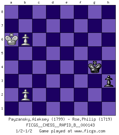 Last move : 1/2-1/2 2010 March 18 13:59:28 [Event "FICGS__CHESS__RAPID_B__000143"] [Site "FICGS"] [Date "2010.02.23"] [Round "1"] [White "Payzansky,Aleksey"] [Black "Roe,Philip"] [Result "1/2-1/2"] [WhiteElo "1799"] [BlackElo "1719"] 1.e4 c6 2.d4 d5 3.Nc3 dxe4 4.Nxe4 Bf5 5.Ng3 Bg6 6.h4 h6 7.Nf3 Nd7 8.h5 Bh7 9.Bd3 Bxd3 10.Qxd3 e6 11.Bf4 Qa5+ 12.Bd2 Bb4 13.c3 Be7 14.c4 Qc7 15.d5 cxd5 16.cxd5 Qd6 17.Qb3 Ngf6 18.dxe6 Qxe6+ 19.Kf1 Qxb3 20.axb3 O-O 21.Nf5 Rfe8 22.Rh4 Nb6 23.Bb4 Bxb4 24.Rxb4 Red8 25.g4 Nbd5 26.Rd4 Re8 27.Nd6 Re7 28.Nd2 a6 29.N2c4 Nb4 30.Nf5 Re6 31.Rad1 Nc6 32.Rf4 b5 33.Nb6 Rd8 34.Rxd8+ Nxd8 35.Nd7 Nxd7 36.Rd4 Nf6 37.Rxd8+ Re8 38.Rxe8+ Nxe8 39.Ke2 Kh7 40.Kd3 g6 41.Ng3 Kg7 42.Kd4 Kf6 43.Ne4+ Ke7 44.hxg6 fxg6 45.Ke5 Nc7 46.f4 Ne6 47.f5 gxf5 48.Kxf5 Kf7 49.Ke5 Ng7 50.b4 Kg6 51.Kd5 Ne8 52.Ke6 Nc7+ 53.Kd6 Ne8+ 54.Kc6 Nf6 55.Nxf6 Kxf6 56.Kb6 Kg5 57.Kxa6 Kxg4 58.Kxb5 h5 59.Ka6 h4 60.b5 h3 61.b6 1/2-1/2 Caro-Kann : Classical, 7...Nd7 Kingside Castling by player Black (move 20) 10 pieces endgame at move 48 : White KNPPP , Black KNPPP WHITE : King + 1 Knight 3 Pawns BLACK : King + 1 Knight 3 Pawns 9 pieces endgame at move 55 : White KNPPP , Black KPPP WHITE : King + 1 Knight 3 Pawns BLACK : King + 3 Pawns 8 pieces endgame at move 55 : White KPPP , Black KPPP WHITE : King + 3 Pawns BLACK : King + 3 Pawns 7 pieces endgame at move 57 : White KPPP , Black KPP WHITE : King + 3 Pawns BLACK : King + 2 Pawns 6 pieces endgame at move 57 : White KPP , Black KPP WHITE : King + 2 Pawns BLACK : King + 2 Pawns 5 pieces endgame at move 58 : White KPP , Black KP WHITE : King + 2 Pawns BLACK : King + 1 Pawn This chess game ended in a draw. Follow this game move after move (download)I have always a slight feeling of pity for the man who has no knowledge of Chess. (Siegbert Tarrasch) Herr Iljumschinow ist ein etwas merkwürdiger Geschäftsmann: Er arbeitet zusammen mit Leuten wie Muammar al-Gaddafi; früher ist das Saddam Hussein gewesen. (Joel Lautier) El Ajedrez por encima de todo... ¡es una pelea!. (Emanuel Lasker) Psychologiquement, tu dois avoir confiance en toi même, mais cette confiance doit être basée sur des faits. (Robert Fischer) Ah, beer! The cause of, and the solution to, all of life's problems. (Homer Simpson)