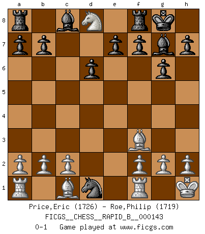 Last move : 0-1 2010 April 7 20:45:54 [Event "FICGS__CHESS__RAPID_B__000143"] [Site "FICGS"] [Date "2010.02.23"] [Round "1"] [White "Price,Eric"] [Black "Roe,Philip"] [Result "0-1"] [WhiteElo "1726"] [BlackElo "1719"] 1.e4 c5 2.Nf3 d6 3.d4 cxd4 4.Nxd4 Nf6 5.Nc3 g6 6.Be2 Bg7 7.O-O Nc6 8.Kh1 O-O 9.Bf3 Nxe4 10.Nxc6 Nxc3 11.Nxd8 Nxd1 0-1 This chess game has been lost on time (started : 2010.02.23 1:27:42) Sicilian : Dragon variation Kingside Castling by player White (move 7) Kingside Castling by player Black (move 8) Player Black won this chess game. Follow this game move after move (download)When in doubt... play Chess ! (Tevis) Schach wird sich dank seiner hohen kulturellen Tradition immer durchsetzen. In näherer Zukunft womöglich sogar als Gegenreaktion auf die maßlose Reizüberflutung im Freizeit- und Spielbereich. (Garry Kasparov) La caracteristica mas importante en la posición del Ajedrez es la actividad de las piezas. Esto es absolutamente fundamental en todas las fases del juego: Apertura, Juego Medio y especialmente Finales. La limitación primordial en la actividad de una pieza, es la estructuración de los Peones. (Michael Stean) Les échecs sont plus proches de l'art de l'assassinat que de l'art de la guerre. (Arturo Perez-Reverte) Life is pain my dear and anyone who says otherwise is selling something. (Princess Bride)