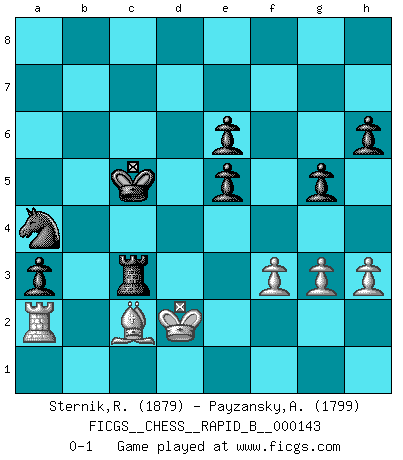 Last move : 0-1 2010 April 16 22:29:34 [Event "FICGS__CHESS__RAPID_B__000143"] [Site "FICGS"] [Date "2010.02.23"] [Round "1"] [White "Sternik,Ryszard"] [Black "Payzansky,Aleksey"] [Result "0-1"] [WhiteElo "1879"] [BlackElo "1799"] 1.e4 c5 2.Nc3 Nc6 3.g3 g6 4.Bg2 Bg7 5.Nf3 d6 6.O-O Nf6 7.d4 Bg4 8.dxc5 dxc5 9.Be3 b6 10.e5 Qxd1 11.Raxd1 Nd7 12.e6 fxe6 13.h3 Bxf3 14.Bxf3 Rc8 15.Rfe1 Nde5 16.Be4 Nc4 17.Bc1 Nd4 18.Nb1 Nf5 19.c3 Kf7 20.Nd2 Nxd2 21.Rxd2 Bh6 22.Rd7 Bxc1 23.Rxc1 Nd6 24.Bg2 a5 25.Ra7 Rhd8 26.Rc2 Nb5 27.Rb7 Rb8 28.Rxb8 Rxb8 29.Re2 Rd8 30.Kf1 Kf6 31.Ke1 Nd6 32.Re3 Nc4 33.Re2 g5 34.b3 Nd6 35.Re3 c4 36.Rf3+ Kg6 37.Re3 Kf7 38.Rf3+ Ke8 39.Re3 Kd7 40.Bf3 Rf8 41.Bg4 Rf6 42.Re5 cxb3 43.axb3 h6 44.Re2 Nb5 45.Kd2 Kd6 46.Kc2 e5 47.f3 Na7 48.Kd3 b5 49.Ke4 Nc6 50.Bh5 Rf8 51.Rd2+ Kc5 52.Rd5+ Kb6 53.Bg4 Ra8 54.Rd1 a4 55.bxa4 bxa4 56.Be6 a3 57.Kf5 Ra5 58.Ba2 Rc5 59.Rb1+ Kc7 60.Rb3 Ra5 61.Kg6 Ra6 62.Kf5 Kd6 63.Rb1 Kc5 64.Rd1 Ra8 65.Rd5+ Kb6 66.Rd1 Rf8+ 67.Ke4 Rc8 68.Be6 Rc7 69.Ba2 Ra7 70.Kf5 Kc7 71.Rb1 Ra8 72.Rb3 Ra6 73.Rb1 Rb6 74.Ra1 Rb5 75.Ke4 Nd8 76.Bd5 e6 77.Bc4 Ra5 78.Ba2 Nb7 79.Ke3 Nc5 80.Rh1 Rb5 81.Bc4 Rb8 82.Ra1 Ra8 83.Ra2 Kd6 84.Be2 Kd5 85.Rd2+ Kc6 86.Ra2 Ra5 87.Bc4 Na4 88.Kd2 Rc5 89.Bd3 Rxc3 90.Bc2 Kc5 0-1 Sicilian : Closed Kingside Castling by player White (move 6) Player Black won this chess game. Follow this game move after move (download)If your opponent offers you a draw, try to work out why he thinks he's worse off. (Nigel Short) Als er Schachweltmeister wurde ließ er praktisch alle stärksten Sovietspieler für sich arbeiten. Wenn ein auch nur mittelmässiger Meister ein Spezialist für eine bestimmte Eröffnung war, wurde er von Karpov gerufen. Das wurde alles geheim gehalten. (Mikhail Moiseyevich Botvinik) Me siento como si fuera una pieza en una partida de Ajedrez, cuando mi oponente me indica: esa pieza no puede ser movida. (Soren Kierkegaard) A chaque perte on perd un peu de soi. (Joël Lautier) Hello Thibault, if I have had a plan (and I had one, I hope), I have forgotten it during the last week... - Hello Heinz-Georg. What do you mean a plan ? (Anonymous players, during a Big Chess game)