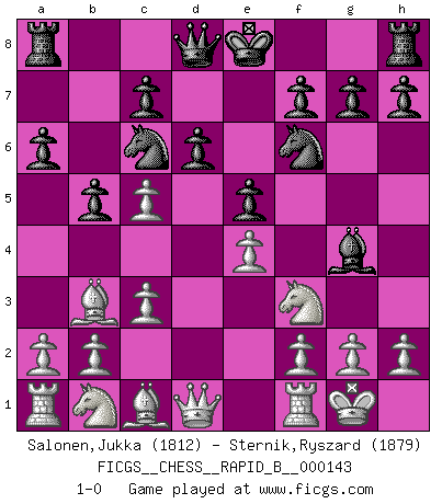 Last move : 1-0 2010 March 6 20:12:15 [Event "FICGS__CHESS__RAPID_B__000143"] [Site "FICGS"] [Date "2010.02.23"] [Round "1"] [White "Salonen,Jukka"] [Black "Sternik,Ryszard"] [Result "1-0"] [WhiteElo "1812"] [BlackElo "1879"] 1.e4 e5 2.Nf3 Nc6 3.Bb5 a6 4.Ba4 Nf6 5.O-O Bc5 6.c3 b5 7.Bb3 d6 8.d4 Bg4 9.dxc5 1-0 Ruy Lopez : Moeller defense Kingside Castling by player White (move 5) Player White won this chess game. Follow this game move after move (download)On the chessboard, lies and hypocrisy do not survive long. (Emanuel Lasker) Das Blackmar-Diemer-Gambit verändert den ganzen Menschen! (Emil Joseph Diemer) Yo siempre he tenido un ligero sentimiento de lástima por una persona que no tiene conocimiento del Ajedrez. (Siegbert Tarrasch) En blitz, le Cavalier l'emporte sur le Fou. (Vlastimil Hort) To steal ideas from one person is plagiarism. To steal from many is research. (Unknown)