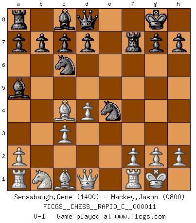 Last move : 0-1 2006 November 29 22:20:24 [Event "FICGS__CHESS__RAPID_C__000011"] [Site "FICGS"] [Date "2006.10.17"] [Round "1"] [White "Sensabaugh,Gene"] [Black "Mackey,Jason"] [Result "0-1"] [WhiteElo "1400"] [BlackElo "0800"] 1.e4 e5 2.Nf3 Nc6 3.Bc4 Bc5 4.b4 Bxb4 5.c3 Ba5 6.O-O Nf6 7.d4 O-O 8.Nxe5 Nxe4 9.Nxf7 Rxf7 0-1 This chess game has been lost on time (started : 2006.10.17 12:0:42) Evans gambit Kingside Castling by player White (move 6) Kingside Castling by player Black (move 7) Player Black won this chess game. Follow this game move after move (download)I am the best player in the world and I am here to prove it. (Bobby Fischer) Die Neutralität betrachte ich als eine schwere Krankheit. (Viktor Kortschnoi) La partida mas dura de ganar es una partida ganada. (Emanuel Lasker) Les réformistes prétendent que les progrès de la théorie conduiront à la disparition des échecs, et qu'il faut, pour leur rendre vie, en remanier les règles. En réalité, qu'exprime cette affirmation? Le mépris de l'intuition, de l'imagination et de tous les autres éléments qui font des échecs un art. (Alexander Alekhine) Logic : The art of thinking and reasoning in strict accordance with the limitations and incapacities of the human misunderstanding. (Ambrose Bierce)