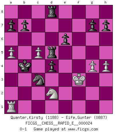 Last move : 0-1 2010 May 14 18:9:27 [Event "FICGS__CHESS__RAPID_E__000024"] [Site "FICGS"] [Date "2010.02.23"] [Round "1"] [White "Quanter,Kirsty"] [Black "Eife,Gunter"] [Result "0-1"] [WhiteElo "1188"] [BlackElo "0887"] 1.e4 c5 2.f4 d6 3.Nf3 e6 4.Bb5+ Bd7 5.Bxd7+ Qxd7 6.d4 Nc6 7.dxc5 dxc5 8.Qxd7+ Kxd7 9.e5 Nd4 10.Nxd4 cxd4 11.O-O f6 12.Rd1 Bc5 13.exf6 Nxf6 14.a3 Rad8 15.b4 Bb6 16.Kh1 Rhf8 17.c4 Ne4 18.c5 Nf2+ 19.Kg1 Nxd1 20.Bd2 Bc7 21.a4 Bxf4 22.Bxf4 Rxf4 23.Nd2 Nc3 24.g3 Rf5 25.Kg2 Kc6 26.a5 Kb5 27.g4 Rg5 28.Kf3 Kxb4 29.h4 Rgd5 0-1 Sicilian : Grand Prix attack Kingside Castling by player White (move 11) Player Black won this chess game. Follow this game move after move (download)I like the moment when I break a man's ego. (Bobby Fischer) Das Schachspiel hat wie die Liebe, die Musik, die Fähigkeit, den Menschen glücklich zu machen. Ich habe ein leises Gefühl des Bedauerns für jeden, der das Schachspiel nicht kennt, so wie ich jeden bedaure, der die Liebe nicht kennt. (Siegbert Tarrasch) ¿Quién es tu oponente esta tarde? Esta tarde mi oponente son las piezas negras. (Akiba Rubinstein) La vie est comme un jeu d'échecs : nous esquissons un plan, mais celui-ci est tributaire de ce que daignent faire l'adversaire aux échecs et le destin dans la vie. (Arthur Schopenhauer) No enterprise is more likely to succeed than one concealed from the enemy until it is ripe for execution. (Niccolo Machiavelli)