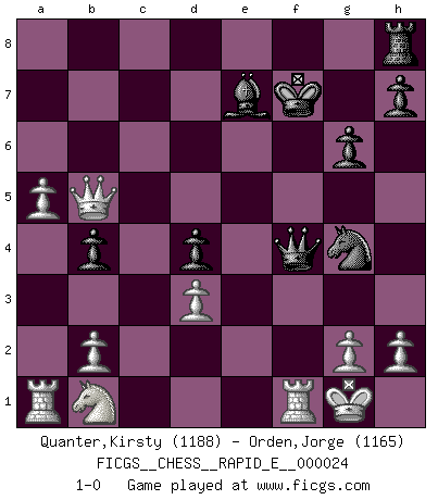 Last move : 1-0 2010 March 22 0:13:55 [Event "FICGS__CHESS__RAPID_E__000024"] [Site "FICGS"] [Date "2010.02.23"] [Round "1"] [White "Quanter,Kirsty"] [Black "Orden,Jorge"] [Result "1-0"] [WhiteElo "1188"] [BlackElo "1165"] 1.e4 c5 2.f4 d6 3.Nf3 Nc6 4.Bb5 Bd7 5.c4 a6 6.Ba4 Rb8 7.d3 b5 8.cxb5 axb5 9.Bb3 Qa5+ 10.Bd2 b4 11.O-O e6 12.a4 d5 13.exd5 exd5 14.Bxd5 Nd4 15.Re1+ Be7 16.Ne5 Bf5 17.Be3 Be6 18.Bxe6 fxe6 19.Bxd4 cxd4 20.Nc6 Qb6 21.Nxb8 Qxb8 22.Rxe6 Qxf4 23.Qh5+ g6 24.Qb5+ Kf7 25.Re1 Nf6 26.a5 Ng4 27.Rf1 1-0 Sicilian : Grand Prix attack Kingside Castling by player White (move 11) Player White won this chess game. Follow this game move after move (download)Human affairs are like a Chess game: only those who do not take it seriously can be called good players. (Hung Tzu Ch'eng) Matt entspricht nicht immer den Tatsachen. (Savielly Grigorievitsch Tartakower) La maestría del Ajedrez consiste esencialmente en analizar posiciónes de Ajedrez con precisión. (Mikhail Botvinnik) Les pièces de l'échiquier étaient impitoyables. Elles le retenaient, elles l'absorbaient. Il y avait de l'horreur en cela, mais aussi une harmonie unique. Car, qu'y a-t-il dans le monde, à part les échecs ? (V. Nabokov) Perhaps chess is the wrong game for the times (The Chess Master and the Computer, by Garry Kasparov - 2010)