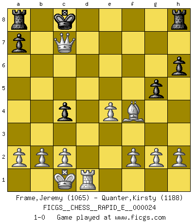 Last move : 1-0 2010 March 3 19:10:54 [Event "FICGS__CHESS__RAPID_E__000024"] [Site "FICGS"] [Date "2010.02.23"] [Round "1"] [White "Frame,Jeremy"] [Black "Quanter,Kirsty"] [Result "1-0"] [WhiteElo "1065"] [BlackElo "1188"] 1.e4 e5 2.Nf3 Nc6 3.Bb5 Nge7 4.d4 exd4 5.Bxc6 Nxc6 6.Nxd4 Nxd4 7.Qxd4 c5 8.Qd5 d6 9.Nc3 g6 10.Bf4 Be6 11.Qxb7 h6 12.Qc6+ Ke7 13.Nd5+ Bxd5 14.Qxd5 Kd7 15.Qxf7+ Be7 16.O-O-O g5 17.Rxd6+ Kc7 18.Rxd8 Kxd8 19.Rd1+ Kc8 20.Qxe7 c4 21.Qc7+ 1-0 Ruy Lopez : Cozio defense Queenside Castling by player White (move 16) Player White won this chess game. Follow this game move after move (download)Any material change in a position must come about by mate, a capture, or a Pawn promotion. (Purdy) Ich würde die 30 stärksten Spieler der USA im Simultanspiel besiegen. (José Raúl Capablanca) Combinaciones deslumbrantes son para la mayoría, mover madera es para los pocos. (Georg Kieninger) Les échecs c'est le défi de l'alpiniste, toujours plus haut, prêt à tout pour monter à l'assaut du Roi ennemi. Les échecs, c'est de la musique en mouvement, un ballet majestueux pour les yeux. C'est de la poésie composée par les fantômes du passé qui au même titre que Rimbaud ou Verlaine méritent notre admiration. Les échecs, c'est de la peinture ou le moindre mouvement modifie le tableau pour en faire un Picasso ou un Van Gogh. Les échecs, c'est tout et rien, c'est la vie et la mort. Jjulie33 sur le forum de France-Echecs. Home computers are being called upon to perform many new functions, including the consumption of homework formerly eaten by the dog. (Doug Larson)