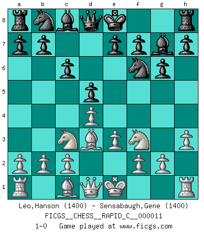 Last move : 1-0 2006 November 28 4:7:31 [Event "FICGS__CHESS__RAPID_C__000011"] [Site "FICGS"] [Date "2006.10.17"] [Round "1"] [White "Leo,Hanson"] [Black "Sensabaugh,Gene"] [Result "1-0"] [WhiteElo "1400"] [BlackElo "1400"] 1.d4 d5 2.Nc3 Nf6 3.h3 c6 4.e3 g6 5.Bd3 Bg7 6.Nf3 1-0 This chess game has been lost on time (started : 2006.10.17 12:0:42) Queen's pawn : Chigorin variation Player White won this chess game. Follow this game move after move (download)Strategy requires thought, tactics require observation. (Max Euwe) Über die Verhaftung Bobby Fischers: Warum es die Bush-Administration für nötig befindet einen 61 Jahre alten Mann zu hetzten, der für niemanden ausser sich selbste eine Gefahr darstellt ist ein Rätsel. (Nigel Short) El Ajedrez es un invernadero donde los frutos del carácter pueden madurar mas completamente que en la vida. (Edward Morgan Foster) Dieu déplace le joueur, et celui-ci la pièce. Quel Dieu derrière Dieu commence donc la trame ? Arturo Perez-Reverte (prix de littérature policière 1993). A person who never made a mistake never tried anything new. (Albert Einstein)