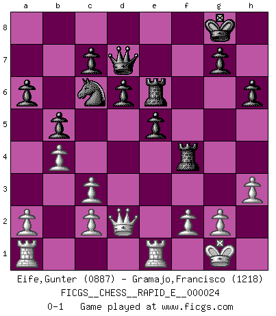 Last move : 0-1 2010 April 14 21:29:14 [Event "FICGS__CHESS__RAPID_E__000024"] [Site "FICGS"] [Date "2010.02.23"] [Round "1"] [White "Eife,Gunter"] [Black "Gramajo,Francisco"] [Result "0-1"] [WhiteElo "0887"] [BlackElo "1218"] 1.e4 e5 2.Nf3 Nc6 3.Nc3 Bb4 4.Bc4 h6 5.O-O Bxc3 6.dxc3 Nf6 7.Be3 Nxe4 8.Bd5 Nf6 9.Bc4 O-O 10.Re1 d6 11.h3 a6 12.b4 b5 13.Bd3 Be6 14.Nd2 Qd7 15.Ne4 Nxe4 16.Bxe4 Rae8 17.Qd2 f5 18.Bd5 f4 19.Bxe6+ Rxe6 20.Bxf4 Rxf4 0-1 Three knights game Kingside Castling by player White (move 5) Kingside Castling by player Black (move 9) Player Black won this chess game. Follow this game move after move (download)The Pin is mightier than the sword. (Fred Reinfeld) Auf Remis zu spielen ist gewissermaßen ein Verbrechen gegen das Schachspiel. (Mikhail Nekhemyevich Tal) Un jugador que trata de regresar una movida en el Ajedrez es un futuro carterista. (Richard Fenton) Le pion, dans sa simplicité, marche droit devant lui, mais lorsqu'il prend, il le fait obliquement? Ainsi l'homme, tant qu'il reste pauvre, marche dans la droiture et vit honnêtement, mais lorsqu'il recherche les honneurs, il flatte, se parjure et, par les voies obliques, cherche une position supérieure sur l'échiquier du monde. (Jean de Galles) I take risks, sometimes patients die, but not taking risks causes more patients to die. So I guess my biggest problem is I've been cursed with the ability to do the math. (Gregory House, House M.D.)