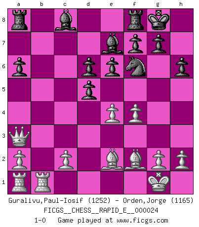 Last move : 1-0 2010 February 28 17:35:51 [Event "FICGS__CHESS__RAPID_E__000024"] [Site "FICGS"] [Date "2010.02.23"] [Round "1"] [White "Guralivu,Paul-Iosif"] [Black "Orden,Jorge"] [Result "1-0"] [WhiteElo "1252"] [BlackElo "1165"] 1.e4 c5 2.Nf3 d6 3.d4 cxd4 4.Nxd4 Nf6 5.Nc3 a6 6.Be2 e6 7.O-O Be7 8.Bg5 O-O 9.Qd3 Nc6 10.f4 h6 11.Bh4 Qb6 12.Bf2 Qxb2 13.Nxc6 bxc6 14.Rfb1 Qa3 15.Nd5 cxd5 16.Qxa3 1-0 Sicilian : Najdorf, Opovcensky variation Kingside Castling by player White (move 7) Kingside Castling by player Black (move 8) Player White won this chess game. Follow this game move after move (download)Pawn endings are to Chess what putting is to golf. (Cecil Purdy) Wenn es im Universum noch irgendwo intelligente Lebewesen gibt, dann kennen sie Go. (Emanuel Lasker) Un entendimiento minucioso de las típicas continuaciones de mate hacen de las mas complicadas combinaciones de sacrificio que conducen hacia ellas no solo no dificiles, sino casi un asunto de rutina. (Siegbert Tarrasch) Il (Jacob Murray) ne joue pas pour le bon coup, mais pour le meilleur. (Eloi Relange) First of all, we have to go back to the classical time control. (Anatoly Karpov)