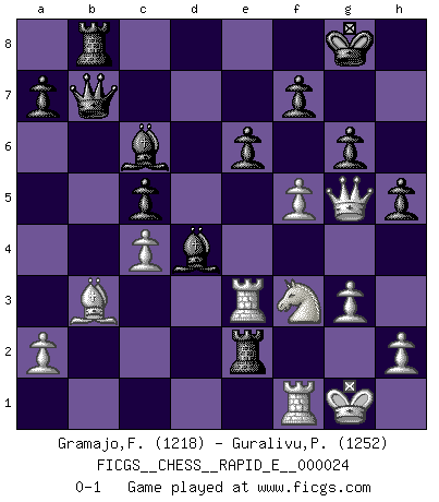 Last move : 0-1 2010 February 26 23:50:11 [Event "FICGS__CHESS__RAPID_E__000024"] [Site "FICGS"] [Date "2010.02.23"] [Round "1"] [White "Gramajo,Francisco"] [Black "Guralivu,Paul-Iosif"] [Result "0-1"] [WhiteElo "1218"] [BlackElo "1252"] 1.d4 Nf6 2.Bg5 e6 3.e4 Be7 4.Bxf6 Bxf6 5.e5 Be7 6.Bd3 c5 7.Qg4 g6 8.Nf3 Nc6 9.c3 cxd4 10.Nxd4 d6 11.Bb5 Bd7 12.Nxc6 bxc6 13.exd6 Bxd6 14.Bc4 O-O 15.O-O Rb8 16.b4 c5 17.b5 Bxb5 18.Na3 Bc6 19.Rad1 Qc7 20.g3 Be5 21.Rd3 Rfd8 22.f4 Bg7 23.Re3 Qa5 24.Nc2 Qa4 25.Bb3 Qa6 26.c4 Qb7 27.Ne1 Rd2 28.Nf3 h5 29.Qg5 Bd4 30.f5 Re2 0-1 Trompowsky attack (Ruth, Opovcensky Opening) Kingside Castling by player Black (move 14) Kingside Castling by player White (move 15) Player Black won this chess game. Follow this game move after move (download)We don't really know how the game was invented, though there are suspicions. As soon as we discover the culprits, we'll let you know. (Bruce Pandolfini) Die starken Figuren des Gegners muss man abtauschen. (José Raúl Capablanca) Fischer no está bajo la obligación de nadie. (Joseph Platz) Même si l'adversaire joue le coup analysé précédemment, recommencez l'analyse en voyant la nouvelle position. Première règle de Blumenfeld There are three kinds of lies: lies, damned lies and statistics. (Mark Twain)