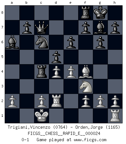 Last move : 0-1 2010 May 6 19:51:53 [Event "FICGS__CHESS__RAPID_E__000024"] [Site "FICGS"] [Date "2010.02.23"] [Round "1"] [White "Trigiani,Vincenzo"] [Black "Orden,Jorge"] [Result "0-1"] [WhiteElo "0764"] [BlackElo "1165"] 1.d4 d5 2.Bf4 g6 3.Nc3 Bg7 4.Nb5 Na6 5.Nxc7+ Nxc7 6.e3 e6 7.Bb5+ Bd7 8.Nf3 Bxb5 9.b3 Ne7 10.Qd2 a5 11.O-O-O a4 12.bxa4 Rxa4 13.Qc3 Rc4 14.Qa5 O-O 15.e4 Ba6 16.Rd2 Nc6 17.Qxc7 Qxc7 0-1 This chess game has been lost on time (started : 2010.02.23 5:47:14) Queen's pawn, Mason variation Queenside Castling by player White (move 11) Kingside Castling by player Black (move 14) Player Black won this chess game. Follow this game move after move (download)Bobby is the finest Chess player this country ever produced. His memory for the moves, his brilliance in dreaming up combinations, and his fierce determination to win are uncanny. (John Collins) Die Auseinandersetzung mit Karpow war politisch geprägt. Er stand für das kommunistische System, wurde von dessen Repräsentanten gehätschelt. Ich war der Oppositionelle. Jeder Schachweltmeister spiegelt auch die gesellschaftlichen Verhältnisse wider. Kramnik steht für die Börsen-Generation des Neuen Markts, ideologiefrei, zahlenfixiert. (Garry Kasparov) El jugador táctico debe saber que hacer cuando algo se debe de hacer. El estratégico debe saber que hacer cuando nada se debe de hacer. (Savielly Tartakover) Les Echecs mettent en conflit, non pas deux intelligences, mais deux volontés. (Lasker) Memory is a way of holding onto the things you love, the things you are, the things you never want to lose. (from the television show: The Wonder Years)