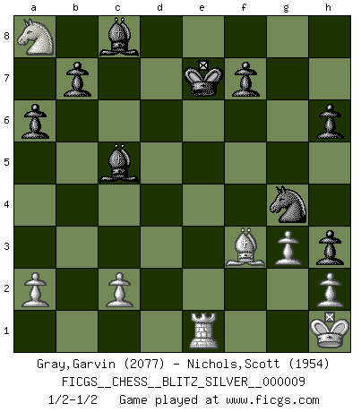 Last move : 1/2-1/2 2010 February 23 14:34:58 [Event "FICGS__CHESS__BLITZ_SILVER__000009"] [Site "FICGS"] [Date "2010.02.23"] [Round "1"] [White "Gray,Garvin"] [Black "Nichols,Scott"] [Result "1/2-1/2"] [WhiteElo "2077"] [BlackElo "1954"] 1.e4 c5 2.Nf3 d6 3.d4 cxd4 4.Nxd4 Nf6 5.Nc3 a6 6.Bg5 e6 7.f4 Qb6 8.Qd2 Qxb2 9.Rb1 Qa3 10.e5 h6 11.Bh4 dxe5 12.fxe5 g5 13.exf6 gxh4 14.Be2 Qa5 15.O-O Nd7 16.Kh1 Qg5 17.Rf4 e5 18.Nd5 exd4 19.Qxd4 Kd8 20.Rd1 h3 21.g3 Bd6 22.Re4 Re8 23.Nb6 Rxe4 24.Qxe4 Qc5 25.Nxa8 Nxf6 26.Qc4 Ke7 27.Qxc5 Bxc5 28.Bf3 Ng4 29.Re1+ Kd6 30.Rd1+ Ke7 31.Re1+ 1/2-1/2 Sicilian : Najdorf, 7...Qb6 Kingside Castling by player White (move 15) This chess game ended in a draw. Follow this game move after move (download)Good offense and good defense both begin with good development. (Bruce A. Moon) Besser ein falscher Plan, logisch durchgeführt, als gar kein Plan. (Viktor Kortschnoi) Un juego de Ajedrez es un dialogo, una conversación entre un jugador y su oponente. Cada movimiento del oponente puede contener amenazas o tropiezos, pero un jugador no se puede defender de las amenazas o tomar ventaja de los tropiezos si es que no se pregunta a sí mismo: ¿Que es lo que mi oponente va a hacer después de cada movida?. (Bruce A. Moon) On est toujours la mazette de quelqu'un d'autre. (Anonyme) Now be brave and don't look back. Don't look back. (Shmi Skywalker in Star Wars ep.1)
