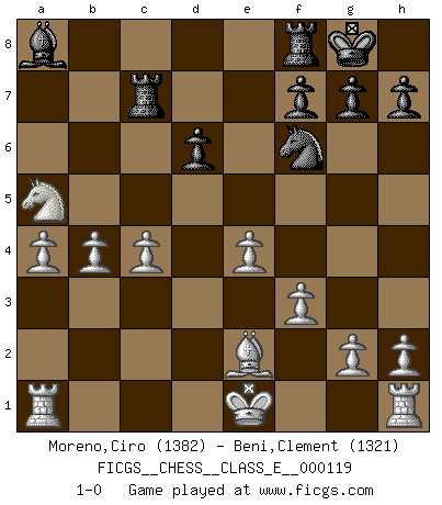 Last move : 1-0 2010 July 9 21:19:47 [Event "FICGS__CHESS__CLASS_E__000119"] [Site "FICGS"] [Date "2010.02.23"] [Round "1"] [White "Moreno,Ciro"] [Black "Beni,Clement"] [Result "1-0"] [WhiteElo "1382"] [BlackElo "1321"] 1.c4 Nf6 2.Nf3 Nc6 3.d4 e6 4.Bg5 Bb4+ 5.Bd2 Bxd2+ 6.Nbxd2 O-O 7.e4 d6 8.Bd3 e5 9.d5 Nd4 10.Nxd4 exd4 11.Nb3 c5 12.dxc6 Bg4 13.f3 Bc8 14.cxb7 Bxb7 15.Be2 Rc8 16.Qxd4 a5 17.Qa7 Ba8 18.Qxa5 Qxa5+ 19.Nxa5 Rc5 20.b4 Rc7 21.a4 1-0 English Opening Kingside Castling by player Black (move 6) Player White won this chess game. Follow this game move after move (download)Chess is mental torture. (Garry Kasparov) Ohne Leiden bildet sich kein Charakter. (Ernst Freiherr von Feuchtersleben) Bendita sea la memoria de aquel que dio al mundo este juego inmortal. (A. G. Gardiner) Des points faibles ou des trous dans la position de l'adversaire doivent être occupés par des pièces et non pas par des pions. (Siegbert Tarrasch) To err is human, but to really foul things up requires a computer. (Farmer's Almanac, 1978)
