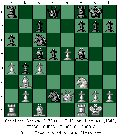 Last move : 0-1 2006 September 25 15:10:39 [Event "FICGS__CHESS__CLASS_C__000002"] [Site "FICGS"] [Date "2006.04.26"] [Round "1"] [White "Cridland,Graham"] [Black "Fillion,Nicolas"] [Result "0-1"] [WhiteElo "1700"] [BlackElo "1640"] 1.e4 e5 2.Nf3 Nc6 3.Bb5 a6 4.Ba4 Nf6 5.O-O Nxe4 6.d4 b5 7.Bb3 d5 8.dxe5 Be6 9.c3 Bc5 10.Nbd2 O-O 11.Qe2 Bf5 12.a4 b4 13.c4 Nxd2 0-1 Ruy Lopez : Open, 7.Bb3 Kingside Castling by player White (move 5) Kingside Castling by player Black (move 10) Player Black won this chess game. Follow this game move after move (download)No other master has such a terrific will to win. At the board he radiates danger, and even the strongest opponents tend to freeze, like rabbits when they smell a panther. Even his weaknesses are dangerous. As white, his opening game is predictable - you can make plans against it - but so strong that your plans almost never work. In the middle game his precision and invention are fabulous, and in the end game you simply cannot beat him. (Anonymous German Expert) Es genügt nicht ein guter Spieler zu sein, man muß auch gut spielen. (Siegbert Tarrasch) En la vida, como en el Ajedrez, los Peones propios obstruyen nuestro camino. La gran fortuna de un hombre, su comodidad, placer, hijos, libros, que deberían ayudarle a ganar, con mucha frecuencia lo ponen en Jaque Mate. (Charles Buxton) Les échecs sont un jeu terrible. Si vous n'avez pas le centre, votre adversaire a une position plus libre. Par contre, si vous avez le centre, alors vous avez vraiment quelque chose pour laquelle vous inquiéter ! (Siegbert Tarrasch) The age of a woman doesn't mean a thing. The best tunes are played on the oldest fiddles. (Ralph Waldo Emerson)