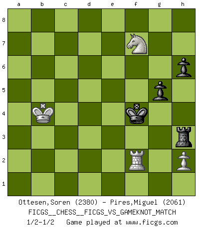 Last move : 1/2-1/2 2007 June 8 13:58:54 [Event "FICGS__CHESS__FICGS_VS_GAMEKNOT_MATCH"] [Site "FICGS"] [Date "2006.10.17"] [Round "1"] [White "Ottesen,Soren"] [Black "Pires,Miguel"] [Result "1/2-1/2"] [WhiteElo "2380"] [BlackElo "2061"] 1.e4 c5 2.Nf3 d6 3.d4 cxd4 4.Nxd4 Nf6 5.Nc3 a6 6.Be3 e6 7.f3 b5 8.Qd2 b4 9.Nce2 d5 10.e5 Nfd7 11.f4 Be7 12.Ng3 Bb7 13.Be2 Bc5 14.Nb3 Bxe3 15.Qxe3 Nc6 16.O-O O-O 17.a3 a5 18.Bb5 Qc7 19.Nh5 Rfc8 20.Bxc6 Bxc6 21.Nd4 g6 22.Nf6+ Nxf6 23.exf6 Kh8 24.Qh3 Qd8 25.Qh4 Ba4 26.Rf2 Qf8 27.f5 exf5 28.Re2 Re8 29.Re7 Rxe7 30.fxe7 Qb8 31.axb4 Qxb4 32.c3 Qxb2 33.Rxa4 Qxc3 34.Qg3 Qc1+ 35.Kf2 Re8 36.Qd6 Qg5 37.Nf3 Qxe7 38.Qxe7 Rxe7 39.Rxa5 Kg7 40.Rxd5 Kf6 41.g3 Ra7 42.Rd6+ Ke7 43.Rd3 Kf6 44.Ke3 Re7+ 45.Kd2 h6 46.Rb3 f4 47.gxf4 Kf5 48.Rb4 Re4 49.Rb7 Kg4 50.Ne5+ Kxf4 51.Nxf7 Ra4 52.Rb2 g5 53.Kc3 Ra3+ 54.Kb4 Rh3 55.Rf2+ 1/2-1/2 Sicilian : Najdorf, Byrne (English) attack Kingside Castling by player White (move 16) Kingside Castling by player Black (move 16) 10 pieces endgame at move 47 : White KRNPP , Black KRPPP WHITE : King + 1 Rook 1 Knight 2 Pawns BLACK : King + 1 Rook 3 Pawns 9 pieces endgame at move 50 : White KRNP , Black KRPPP WHITE : King + 1 Rook 1 Knight 1 Pawn BLACK : King + 1 Rook 3 Pawns 8 pieces endgame at move 51 : White KRNP , Black KRPP WHITE : King + 1 Rook 1 Knight 1 Pawn BLACK : King + 1 Rook 2 Pawns This chess game ended in a draw. Follow this game move after move (download)Chess is not like life... it has rules ! (Mark Pasternak) Um sich vor der Gefahr einer Erkältung zu schützen, sorge der wanderlustige König beizeiten für ein brauchbares Versteck. (Aaron Nimzowitsch) Cuando me preguntan: -¿Cual es el secreto que te hace hacer mejores movidas que tus oponentes?, Yo respondo: Me da gusto que me pregunten eso, porque, como veran, hay una simple razón. Yo pienso mis propias movidas y dejo a mi oponente que el piense las suyas. (Alexander Alekhine) L'ordinateur a tué l'originalité. Il n'y a plus guère d'aventures sur l'échiquier. (Jacob Murray) When you've done things right people won't know you've done anything at all. (Futurama)