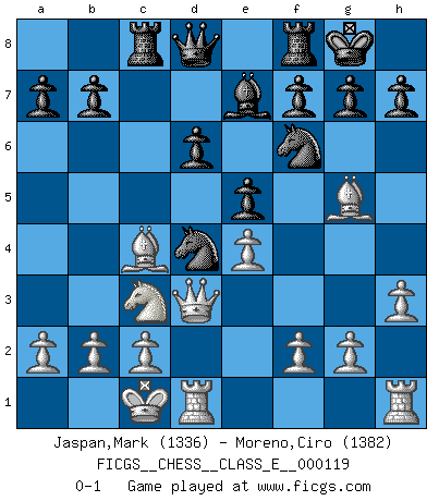 Last move : 0-1 2010 June 19 20:57:1 [Event "FICGS__CHESS__CLASS_E__000119"] [Site "FICGS"] [Date "2010.02.23"] [Round "1"] [White "Jaspan,Mark"] [Black "Moreno,Ciro"] [Result "0-1"] [WhiteElo "1336"] [BlackElo "1382"] 1.e4 c5 2.Nf3 Nc6 3.d4 cxd4 4.Nxd4 d6 5.Nc3 e5 6.Nf3 Be7 7.Bc4 Nf6 8.Bg5 Bg4 9.h3 Bxf3 10.Qxf3 Rc8 11.O-O-O Nd4 12.Qd3 O-O 0-1 This chess game has been lost on time (started : 2010.02.23 21:11:49) Sicilian defense Queenside Castling by player White (move 11) Kingside Castling by player Black (move 12) Player Black won this chess game. Follow this game move after move (download)Chess is a forcing house where the fruits of character can ripen more fully than in life. (Edward Morgan Foster) Drei Punkte vor allen anderen ist wie einer, der im weißen Anzug posiert, während der Rest in Müllsäcke gekleidet dasteht. (Viktor Kortschnoi) ¿Se han dado cuenta de que Fischer casi nunca ha tenido piezas malas? El las intercambia y las piezas malas se quedan con sus oponenets. (Yuri Balashov) Il n'y a pas de prix trop élevé au scalp de l'ennemi. (Koblentz) Difficult things take a long time, impossible things a little longer. (Author unknown)