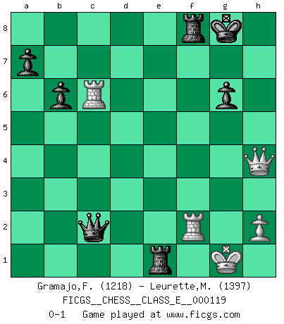 Last move : 0-1 2010 March 15 18:3:56 [Event "FICGS__CHESS__CLASS_E__000119"] [Site "FICGS"] [Date "2010.02.23"] [Round "1"] [White "Gramajo,Francisco"] [Black "Leurette,Marc-Antoine"] [Result "0-1"] [WhiteElo "1218"] [BlackElo "1397"] 1.e4 e5 2.Bb5 c6 3.Bc4 d5 4.exd5 cxd5 5.Bb3 Nf6 6.Nc3 Be6 7.d3 Bc5 8.Bg5 Nbd7 9.Bxf6 Nxf6 10.Qe2 O-O 11.Nf3 e4 12.dxe4 dxe4 13.Nxe4 Nxe4 14.Qxe4 Bxb3 15.O-O Bd5 16.Qg4 Be6 17.Qe4 b6 18.Rad1 Qc8 19.Ng5 g6 20.Qh4 h5 21.Nxe6 Qxe6 22.Rde1 Qxa2 23.g4 Qxb2 24.gxh5 Qxc2 25.hxg6 fxg6 26.Re6 Rae8 27.Rc6 Bxf2+ 28.Rxf2 Re1+ 0-1 King's pawn game Kingside Castling by player Black (move 10) Kingside Castling by player White (move 15) Player Black won this chess game. Follow this game move after move (download)Could we look into the head of a Chess player, we should see there a whole world of feelings, images, ideas, emotion and passion. (Alfred Binet) Intelligenz läßt sich nicht am Weg, sondern nur am Ergebnis feststellen. (Garry Kasparov) Las piezas de Ajedrez son los bloques del alfabeto que moldean los pensamientos; y esos pensamientos, aunque hagan un diseño visual en el tablero, expresan abstractamente su belleza como un poema. (Marcel Duchamp) Si rien de grave n'est détecté lors de l'analyse d'une position, on joue alors le coup. Seconde règle de Blumenfeld. There are two kinds of tragedy in this world, one is not getting what you want and the other is getting. (Lord of war)