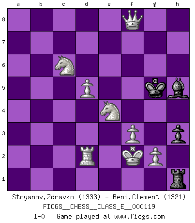 Last move : 1-0 2010 March 17 1:0:46 [Event "FICGS__CHESS__CLASS_E__000119"] [Site "FICGS"] [Date "2010.02.23"] [Round "1"] [White "Stoyanov,Zdravko"] [Black "Beni,Clement"] [Result "1-0"] [WhiteElo "1333"] [BlackElo "1321"] 1.e4 e5 2.Nf3 Nc6 3.a3 Nf6 4.Bb5 Nxe4 5.Bxc6 Nc5 6.Bd5 Qf6 7.d3 c6 8.Bg5 Qd6 9.Bc4 e4 10.Nfd2 exd3 11.cxd3 Qe5+ 12.Be3 Qxb2 13.Ra2 Qf6 14.Qe2 Be7 15.Nf3 b5 16.Bg5 Qd6 17.Bxe7 Qxe7 18.Qxe7+ Kxe7 19.Re2+ Kd8 20.Ne5 Rf8 21.Bxf7 Ke7 22.O-O d6 23.d4 Kf6 24.Bh5 Nb3 25.Nxc6 Bd7 26.d5 g6 27.Bf3 Rac8 28.Nxa7 Rc1 29.Rxc1 Nxc1 30.Rc2 Nd3 31.Be2 Nf4 32.Nc3 Nxe2+ 33.Nxe2 Re8 34.h3 b4 35.axb4 Ba4 36.Rb2 Bd1 37.Nc3 Re1+ 38.Kh2 h5 39.b5 g5 40.b6 g4 41.b7 gxh3 42.Kxh3 Bg4+ 43.Kg3 Rc1 44.Ne4+ Kf5 45.f3 Rh1 46.b8Q h4+ 47.Kf2 Bh5 48.Nxd6+ Ke5 49.Rd2 h3 50.Nc6+ Kf6 51.Qf8+ Kg5 52.Ne4+ 1-0 King's pawn game Kingside Castling by player White (move 22) Promotion Queen by player White (move 46) Player White won this chess game. Follow this game move after move (download)When I asked Fischer why he had not played a certain move in our game, he replied: 'Well, you laughed when I wrote it down !' (Mikhail Tal) Ich war schon mal beim Dopingtest. Da musste ich Urin abgeben, während Dritte zusahen. (Elisabeth Pähtz) Bobby es la celebridad menos entendida y malinterpretada que camina el la faz de esta tierra. (Yasser Seirawan) La menace est plus forte que l'exécution. (Aaron Nimzovitch) Man is still the most extraordinary computer of all. (John F. Kennedy)