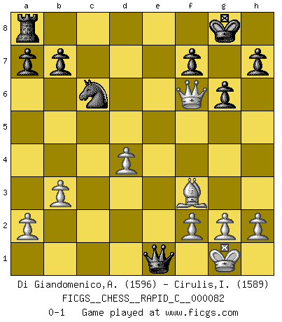 Last move : 0-1 2010 April 12 11:14:59 [Event "FICGS__CHESS__RAPID_C__000082"] [Site "FICGS"] [Date "2010.02.24"] [Round "1"] [White "Di Giandomenico,Alfonso"] [Black "Cirulis,Ilmars"] [Result "0-1"] [WhiteElo "1596"] [BlackElo "1589"] 1.e4 c6 2.d4 d5 3.Nd2 c5 4.c3 cxd4 5.cxd4 dxe4 6.Nxe4 Nf6 7.Nxf6+ exf6 8.Nf3 Bb4+ 9.Bd2 Bxd2+ 10.Qxd2 O-O 11.Be2 Be6 12.O-O Bd5 13.Qf4 Re8 14.Rfe1 Nc6 15.b3 Qa5 16.Qf5 g6 17.Qxf6 Bxf3 18.Bxf3 Rxe1+ 19.Rxe1 Qxe1+ 0-1 Caro-Kann : 3.Nd2 Kingside Castling by player Black (move 10) Kingside Castling by player White (move 12) Player Black won this chess game. Follow this game move after move (download)A man without frontiers. He didn't divide the East and the West, he brought them together in their admiration for him. (Ljubomir Ljubojevic, about Bobby Fischer's death) Privat ist Kortschnoi kein schlechter Mensch, sehr sympathisch. Aber während des Spiels ist er grausam. Er will dich töten. (Miguel Najdorf) ¡Examina movidas que hagan daño! Un buen ojo for movidas desvastantes es mucho mas importante que el conocimiento de principios estratégicos. (Purdy) La tactique, c'est ce que vous faites quand il y a quelque chose à faire; la stratégie, c'est ce que vous faites quand il n'y a rien à faire. (Savielli Tartacower) Chess is as much a mystery as women. (Purdy)