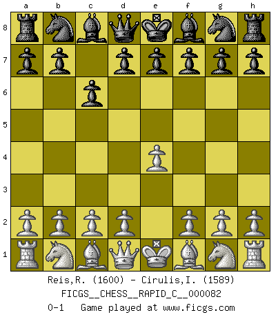 Last move : 0-1 2010 March 28 22:41:51 [Event "FICGS__CHESS__RAPID_C__000082"] [Site "FICGS"] [Date "2010.02.24"] [Round "1"] [White "Reis,Renan do Carmo"] [Black "Cirulis,Ilmars"] [Result "0-1"] [WhiteElo "1600"] [BlackElo "1589"] 1.e4 c6 0-1 This chess game has been lost on time (started : 2010.02.24 13:54:3) Caro-Kann defense Player Black won this chess game. Follow this game move after move (download)You need not play well - just help your opponent to play badly. (Genrikh Chepukaitis) Ich hatte meine größten Erfolge, als ich 47 Jahre alt war. Kasparow war noch nicht mal 42 und hat das Schach schon im Stich gelassen. (Viktor Kortschnoi) Los tropiezos estan todos ahí en el tablero, esperando que se cometan. (Savielly Tartakover) Les sacrifices démontrent seulement que quelqu'un a gaffé. (Savielly Tartacover) Man with more than one clock never knows what time it is. (Chinese thought)