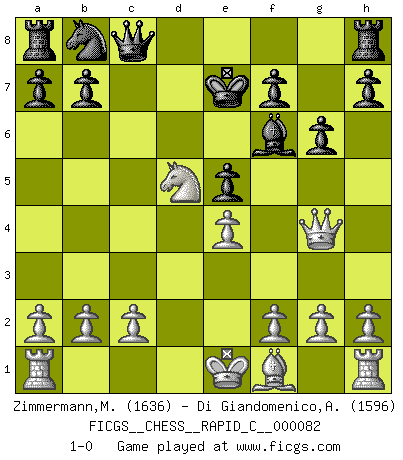 Last move : 1-0 2010 March 25 14:57:59 [Event "FICGS__CHESS__RAPID_C__000082"] [Site "FICGS"] [Date "2010.02.24"] [Round "1"] [White "Zimmermann,Melchior"] [Black "Di Giandomenico,Alfonso"] [Result "1-0"] [WhiteElo "1636"] [BlackElo "1596"] 1.e4 c5 2.d4 cxd4 3.Nf3 e6 4.Nxd4 d6 5.Nc3 Nf6 6.Bg5 Be7 7.Bxf6 Bxf6 8.Qg4 e5 9.Nf5 g6 10.Nxd6+ Ke7 11.Nxc8+ Qxc8 12.Nd5+ 1-0 Sicilian : Smith-Morra gambit Player White won this chess game. Follow this game move after move (download)Is Bobby Fischer quite sane ? (Salo Flohr) Es liegt in der Natur, vernüftig zu denken und unlogisch zu handeln. (Anatole France) Un buen sacrificio es aquel que aunque no sea necesariamente sólido, deja a tu oponente aturdido y confuso. (Rudolph Spielmann) Si rien de grave n'est détecté lors de l'analyse d'une position, on joue alors le coup. Seconde règle de Blumenfeld. There are two kinds of people in the world, my friend. Those who have a loaded gun and those who dig. You dig ! (Blondie in The Good, The Bad and The Ugly)