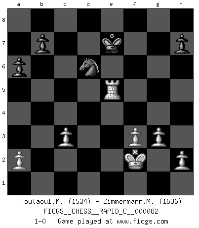 Last move : 1-0 2010 May 10 12:39:34 [Event "FICGS__CHESS__RAPID_C__000082"] [Site "FICGS"] [Date "2010.02.24"] [Round "1"] [White "Toutaoui,Khaled"] [Black "Zimmermann,Melchior"] [Result "1-0"] [WhiteElo "1534"] [BlackElo "1636"] 1.d4 e5 2.dxe5 d6 3.exd6 Bxd6 4.Nf3 Nf6 5.g3 O-O 6.Bg2 Nc6 7.Bg5 Be7 8.O-O Qxd1 9.Rxd1 Bf5 10.c3 Rad8 11.Nbd2 Ne4 12.Nxe4 Bxe4 13.Bxe7 Nxe7 14.Nd4 Bxg2 15.Kxg2 Rfe8 16.e4 Ng6 17.f3 Ne5 18.Nb5 c6 19.Nd4 c5 20.Nf5 g6 21.Ne3 c4 22.Nd5 Rd6 23.Rd4 Red8 24.Rad1 f5 25.Ne7+ Kf7 26.Rxd6 Rxd6 27.Rxd6 Kxe7 28.Rd5 Nd3 29.b3 Nb2 30.exf5 gxf5 31.bxc4 Nxc4 32.Kf2 a6 33.Rxf5 Nd6 34.Re5+ 1-0 Queen's pawn : Charlick (Englund) gambit Kingside Castling by player Black (move 5) Kingside Castling by player White (move 8) Player White won this chess game. Follow this game move after move (download)I like the moment when I break a man's ego. (Bobby Fischer) Fallen sollten polizeilich verboten werden. (Savielly Grigorievitsch Tartakower) El Ajedrez es un juego de pelea el cual es puramente intelectual e incluye la suerte. (Richard Reti) Je menace de comprendre la position. (Anonyme) Life is the sum of all your choices. (Albert Camus)