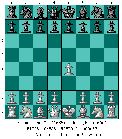 Last move : 1-0 2010 March 31 20:26:14 [Event "FICGS__CHESS__RAPID_C__000082"] [Site "FICGS"] [Date "2010.02.24"] [Round "1"] [White "Zimmermann,Melchior"] [Black "Reis,Renan do Carmo"] [Result "1-0"] [WhiteElo "1636"] [BlackElo "1600"] 1.e4 1-0 This chess game has been lost on time (started : 2010.02.24 13:54:3) King's pawn Opening Player White won this chess game. Follow this game move after move (download)If your opponent offers you a draw, try to work out why he thinks he's worse off. (Nigel Short) Ich habe die Schachforschung dermaßen betrieben, dass sie auf eine wissenschaftliche Basis gestellt wurde. (Mikhail Moiseyevich Botvinik) Solo el jugador con la iniciativa tiene el derecho a atacar. (Wilhelm Steinitz) J'ai vu le vaincu d'Echecs jouer des années durant dans l'espoir de la fête de la victoire. Car tu es plus riche de ce qu'elle existe si même elle n'est point pour toi. Ainsi de la perle du fond des mers. (Antoine de Saint-Exupéry) There are 10 types of people in this world: those who understand binary and those who don't. (Anonymous)