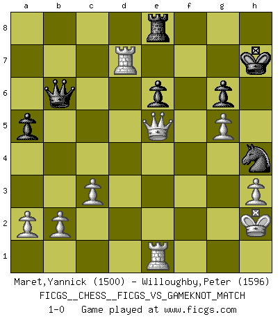 Last move : 1-0 2006 November 1 19:0:45 [Event "FICGS__CHESS__FICGS_VS_GAMEKNOT_MATCH"] [Site "FICGS"] [Date "2006.10.17"] [Round "1"] [White "Maret,Yannick"] [Black "Willoughby,Peter"] [Result "1-0"] [WhiteElo "1500"] [BlackElo "1596"] 1.e4 c5 2.Nf3 Nc6 3.d4 cxd4 4.Nxd4 e5 5.Nb5 a6 6.Nd6+ Bxd6 7.Qxd6 Qf6 8.Qc5 Nge7 9.Be3 O-O 10.Be2 d6 11.Qc3 d5 12.exd5 Nxd5 13.Qb3 Nde7 14.O-O b5 15.c3 Be6 16.Qc2 Rad8 17.Nd2 Nd5 18.Ne4 Qe7 19.Bc5 Qc7 20.Bxf8 Rxf8 21.Bf3 Nde7 22.Ng5 g6 23.Nxe6 fxe6 24.Bg4 Nf5 25.Qb3 Qf7 26.Bf3 Na5 27.Qb4 Nc4 28.Rad1 Nh4 29.Be2 e4 30.Bxc4 bxc4 31.Qxc4 h5 32.Qxe4 Nf5 33.f3 Qa7+ 34.Kh1 Qb6 35.Rd2 a5 36.Re1 Re8 37.g4 hxg4 38.fxg4 Nh4 39.h3 Kg7 40.g5 Nf5 41.Qe5+ Kh7 42.Kh2 Nh4 43.Rd7+ 1-0 Sicilian : Labourdonnais-Loewenthal variation Kingside Castling by player Black (move 9) Kingside Castling by player White (move 14) Player White won this chess game. Follow this game move after move (download)Chess, like love, like music, has the power to make people happy. (Siegbert Tarrasch) Computer sind die einzigen Gegner, die nicht immer eine Ausrede auf Lager haben, wenn sie gegen mich verlieren. (Robert James Fischer) El Ajedrez es imaginación. (David Bronstein) Les échecs, c'est l'art d'analyser. (Mikhail Botvinnik) Chess is everything: art, science and sport. (Anatoly Karpov)