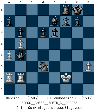 Last move : 0-1 2010 May 3 20:30:16 [Event "FICGS__CHESS__RAPID_C__000082"] [Site "FICGS"] [Date "2010.02.24"] [Round "1"] [White "Henrion,Yann"] [Black "Di Giandomenico,Alfonso"] [Result "0-1"] [WhiteElo "1506"] [BlackElo "1596"] 1.c4 c5 2.Nc3 Nf6 3.e3 e6 4.d4 cxd4 5.exd4 Be7 6.Bg5 d6 7.Nf3 O-O 8.Be2 Nc6 9.O-O Bd7 10.h3 Rc8 11.Re1 h6 12.a3 hxg5 13.b4 b6 14.Nxg5 Nh7 15.Nxh7 Kxh7 16.d5 Ne5 17.Qc2+ Kg8 18.Nb5 Bxb5 19.cxb5 Rxc2 20.f4 Ng6 21.Bd3 Rxg2+ 22.Kxg2 Nxf4+ 23.Kf3 Nxd3 24.Re2 Ne5+ 25.Ke4 Qc8 26.R1a2 Qc4+ 27.Ke3 Qxd5 28.a4 Qb3+ 29.Kf2 Qxb4 30.Reb2 Nd3+ 0-1 English : Symmetrical variation Kingside Castling by player Black (move 7) Kingside Castling by player White (move 9) Player Black won this chess game. Follow this game move after move (download)Fischer is an American Chess tragedy on par with Morphy and Pillsbury. (Mig Greengard) Je älter ich werde, um so mehr schätze ich die Bauern. (Paul Keres) El poder defensivo de una pieza clavada, solamente es imaginario. (Aaron Nimzovich) Nous vivons dans un monde échiquéen : chaque jour qui passe est un défi à relever. (Philosophe Sasha) All art requires courage. (Anne Tucker)