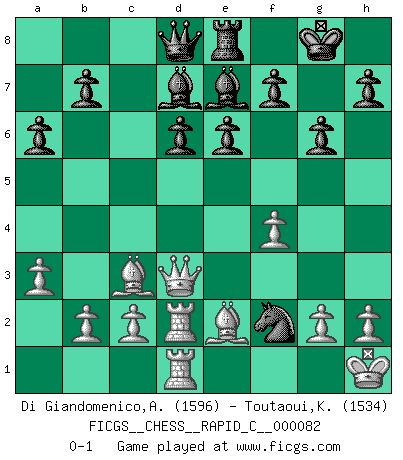 Last move : 0-1 2010 March 16 14:55:57 [Event "FICGS__CHESS__RAPID_C__000082"] [Site "FICGS"] [Date "2010.02.24"] [Round "1"] [White "Di Giandomenico,Alfonso"] [Black "Toutaoui,Khaled"] [Result "0-1"] [WhiteElo "1596"] [BlackElo "1534"] 1.e4 c5 2.Nf3 d6 3.d4 cxd4 4.Nxd4 Nf6 5.Nc3 Nc6 6.Be3 e6 7.Be2 Be7 8.O-O O-O 9.Kh1 Bd7 10.f4 a6 11.Qe1 Rc8 12.Rd1 Nb4 13.Rd2 Re8 14.a3 Nc6 15.Qg3 Nxd4 16.Bxd4 g6 17.Rfd1 Rxc3 18.Bxc3 Nxe4 19.Qd3 Nf2+ 0-1 Sicilian Kingside Castling by player White (move 8) Kingside Castling by player Black (move 8) Player Black won this chess game. Follow this game move after move (download)The King is a fighting piece. Use it ! (Wilhelm Steinitz) Matt entspricht nicht immer den Tatsachen. (Savielly Grigorievitsch Tartakower) El tablero es el mundo, las piezas es el fenomeno del universo, las reglas del juego son lo que llamamos leyes de la naturaleza y el jugador del lado opuesto, se encuentra oculto a nuestra vista. (Thomas Huxley) Dieu déplace le joueur, et celui-ci la pièce. Quel Dieu derrière Dieu commence donc la trame ? Arturo Perez-Reverte (prix de littérature policière 1993). Players are not good because they find tactics, it is about the way to find the positions in which those tactics are hidden. (Luc-Olivier Leclerc)