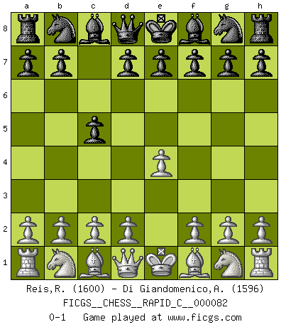 Last move : 0-1 2010 March 27 21:39:56 [Event "FICGS__CHESS__RAPID_C__000082"] [Site "FICGS"] [Date "2010.02.24"] [Round "1"] [White "Reis,Renan do Carmo"] [Black "Di Giandomenico,Alfonso"] [Result "0-1"] [WhiteElo "1600"] [BlackElo "1596"] 1.e4 c5 0-1 This chess game has been lost on time (started : 2010.02.24 13:54:3) Sicilian defense Player Black won this chess game. Follow this game move after move (download)The enormous mental resilience, without which no Chess player can exist, was so much taken up by Chess that he could never free his mind of this game. (Albert Einstein) Ein Gewinn durch eine ungenaue Kombination, sei sie auch noch so vorzeigbar, erfüllt mich mit Schaudern. (Wilhelm Steinitz) Evita las multitudes. Haz independientemente tu propio razonamiento. Trata de ser el jugador de Ajedrez, no la pieza de Ajedrez. (Ralph Charell) Ne tendez aucun piège pour le plaisir ! Ne jouez rien dans l'espoir que l'adversaire réagisse de façon stupide ! Prenez toujours pour acquis que l'adversaire va trouver le meilleur coup ! Ne jouez jamais de coup dans l'espoir que l'adversaire ne voie pas la menace ! Chacun de vos coups doit améliorer la position d'une façon ou d'une autre. Somewhere in the world there is an epigram for every dilemma. (Hendrik Willem van Loon)