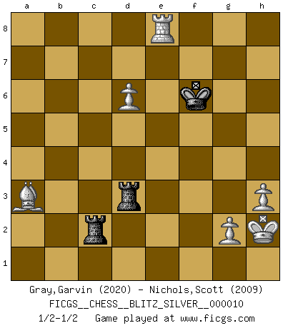 Last move : 1/2-1/2 2010 February 24 20:22:42 [Event "FICGS__CHESS__BLITZ_SILVER__000010"] [Site "FICGS"] [Date "2010.02.24"] [Round "1"] [White "Gray,Garvin"] [Black "Nichols,Scott"] [Result "1/2-1/2"] [WhiteElo "2020"] [BlackElo "2009"] 1.d4 Nf6 2.c4 e6 3.Nf3 c5 4.d5 exd5 5.cxd5 d6 6.Nc3 g6 7.e4 Bg7 8.Nd2 Nbd7 9.Be2 O-O 10.O-O Re8 11.a4 a6 12.f4 Qc7 13.Kh1 Rb8 14.Qc2 h5 15.e5 dxe5 16.f5 gxf5 17.Rxf5 Nf8 18.Rf1 N8h7 19.Nde4 Nxe4 20.Nxe4 f5 21.Bxh5 Rf8 22.Qxc5 Qxc5 23.Nxc5 Nf6 24.Be2 f4 25.Ne6 Re8 26.Bc4 Bf8 27.Nxf8 Kxf8 28.a5 Kg7 29.b3 Kg6 30.Bb2 Ng4 31.Rf3 Ne3 32.Re1 b6 33.axb6 Rxb6 34.Rfxe3 fxe3 35.Rxe3 a5 36.Bd4 Rb7 37.h3 Bd7 38.Bc3 Bb5 39.Bxa5 Rc8 40.Rxe5 Bxc4 41.bxc4 Rxc4 42.d6 Rd4 43.Bc7 Rb2 44.Re8 Kf6 45.Kh2 R4d2 46.Rg8 Rd4 47.Ba5 Rc2 48.Bb4 R2c4 49.Ba3 Rd3 50.Ra8 Rc2 51.Re8 R3d2 52.Rg8 Rd3 53.Re8 1/2-1/2 Queen's pawn game Kingside Castling by player Black (move 9) Kingside Castling by player White (move 10) 10 pieces endgame at move 41 : White KRBPPPP , Black KRR WHITE : King + 1 Rook 1 Bishop 4 Pawns BLACK : King + 2 Rooks 9 pieces endgame at move 41 : White KRBPPP , Black KRR WHITE : King + 1 Rook 1 Bishop 3 Pawns BLACK : King + 2 Rooks This chess game ended in a draw. Follow this game move after move (download)Chess is a terrible game. If you have no center, your opponent has a freer position. If you do have a center, then you really have something to worry about ! (Siegbert Tarrasch) Die Jungen erwarten, dass Opa einfach umfällt. Dann aber kann Opa fünf Stunden lang Schach spielen und die jungen Gegner an die Wand drücken. (Viktor Kortschnoi) En posiciones complicadas, Bobby Fischer pocas veces tuvo que temer de cualquiera. (Paul Keres) Ce qui est bien, c'est d'avoir tout un tas de pièces en prise : l'adversaire ne peut en prendre qu'une à la fois. Cité par Thierry Audin. I have opinions of my own - strong opinions - but I don't always agree with them. (George Bush)