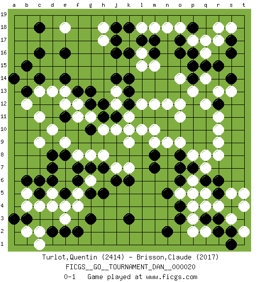 Last move : 0-1 2010 May 11 23:47:39 [Event "FICGS__GO__TOURNAMENT_DAN__000020"] [Site "FICGS"] [Date "2010.02.24"] [Round "1"] [Black "Turlot,Quentin"] [White "Brisson,Claude"] [Result "0-1"] [Rating 1 "2414"] [Rating 2 "2017"] 1.p16 d4 2.c16 r4 3.j16 d13 4.e16 d10 5.k3 r17 6.r15 p17 7.o17 q16 8.q15 o18 9.o16 n18 10.l17 p3 11.g3 r10 12.c6 e3 13.e5 f4 14.h5 g6 15.g5 f5 16.f6 e6 17.f7 e7 18.e8 f8 19.g7 g8 20.h7 d5 21.d8 c9 22.d6 e4 23.d7 b5 24.e5 r13 25.s17 s18 26.s16 r18 27.s4 s5 28.r3 q4 29.s2 q2 30.r2 t4 31.t3 s3 32.p18 q17 33.s4 t5 34.q3 p2 35.r5 s3 36.c5 c4 37.s4 q5 38.r6 s3 39.f2 t2 40.b3 b4 41.e2 b2 42.b13 b14 43.c14 c13 44.b15 b12 45.a14 c11 46.q11 r11 47.p9 q8 48.o7 p8 49.o8 o9 50.q9 r8 51.p11 n9 52.m7 o12 53.q13 m12 54.n10 m10 55.n11 k9 56.m11 l10 57.m8 o11 58.o10 m9 59.l11 k11 60.k12 j12 61.j11 k10 62.h11 l12 63.k13 p10 64.q10 n12 65.p10 q12 66.p12 p13 67.r12 q14 68.p14 q12 69.b6 r9 70.d2 c2 71.a3 c1 72.e11 e9 73.e14 e13 74.f13 f12 75.g13 g11 76.g10 e12 77.o4 j13 78.k14 o14 79.p15 m15 80.m16 l15 81.j14 l16 82.m17 h10 83.g12 f11 84.n2 j10 85.h12 k17 86.k16 h17 87.j17 e18 88.c18 h18 89.j18 m18 90.s14 l18 91.k18 s13 92.q6 p6 93.p7 o5 94.n5 q7 95.o6 p5 96.s1 p4 97.o3 k7 98.k6 j7 99.j6 h8 0-1 Here are the names of the openings (joseki) played in the four corners : Corner q16 : p16 r17 Takamoku (Gomok, Gaomu`) 5-4 Point. The takamoku (high) point (5-4). With its emphasis on influence, the 5-4 point complements the 4-4 (hoshi) point in creating an influence-oriented fuseki. San-san. White plays the 3-3 when Black has a stone at top such as marked. Corner d4 : d4 g3 Hoshi (Hwajeom, Seongjeom, Xingwei`) 4-4 Point. The star or hoshi (4-4) point, emphasizing influence at the potential expense of territory. Niken Kakari (Dukan Keolch'im, E`r Gua`jiao~, 2-Space Low Approach). White typically answers by 7-3 or 3-5 (which is not joseki). Player White won this Go (weiqi, baduk) game. Follow this game move after move (download)A basic: Don't push too hard. (Jansteen) Begin at the beginning and go on till you come to the end; then stop. (Lewis Carrol, Alice in Wonderland)
