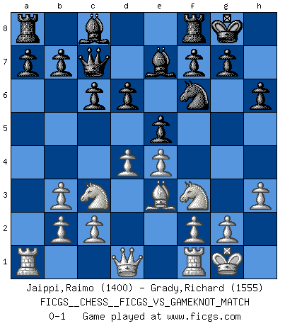 Last move : 0-1 2006 December 10 5:47:54 [Event "FICGS__CHESS__FICGS_VS_GAMEKNOT_MATCH"] [Site "FICGS"] [Date "2006.10.17"] [Round "1"] [White "Jaippi,Raimo"] [Black "Grady,Richard"] [Result "0-1"] [WhiteElo "1400"] [BlackElo "1555"] 1.e4 e5 2.Nf3 Nc6 3.Bc4 Nf6 4.Nc3 h6 5.d3 d6 6.O-O Na5 7.Bb3 Nxb3 8.axb3 Be7 9.Be3 c6 10.h3 O-O 11.d4 Qc7 0-1 This chess game has been lost on time (started : 2006.10.17 12:17:18) Comment by player 1 : Raimo Jaippi : Thanks! You too. Comment by player 2 : Richard Grady : Hello, Raimo! Have a good game. Two knights defense Kingside Castling by player White (move 6) Kingside Castling by player Black (move 10) Player Black won this chess game. Follow this game move after move (download)Good positions don't win games, good moves do. (Gerald Abrahams) Kein Großmeister ist normal. Sie unterscheiden sich nur im Ausmaß Ihrer Verrücktheit. (Viktor Kortschnoi) No es suficiente ser un buen jugador, se debe también de jugar bién. (Siegbert Tarrasch) Les échecs sont un jeu par leur forme, un art par leur essence et une science par sa difficulté d'acquisition. Ils peuvent vous procurer autant de plaisir qu'un bon livre ou une belle musique, mais vous n'aurez une réelle joie que si vous arrivez à bien jouer. (Tigran Petrosian) A married woman is like a fish riding a bicycle. (Rodolfo d'Ettorre)