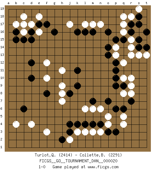 Last move : 1-0 2010 May 24 8:34:49 [Event "FICGS__GO__TOURNAMENT_DAN__000020"] [Site "FICGS"] [Date "2010.02.24"] [Round "1"] [Black "Turlot,Quentin"] [White "Collette,Benjamin"] [Result "1-0"] [Rating 1 "2414"] [Rating 2 "2291"] 1.q15 d4 2.c15 q4 3.c6 f3 4.d10 q17 5.o16 r15 6.r16 q16 7.r17 r18 8.s18 q18 9.s15 r14 10.s14 r13 11.p15 s19 12.s17 s13 13.t16 n17 14.m16 m17 15.l16 l17 16.k16 j17 17.g16 d17 18.c17 c18 19.d16 b17 20.e17 c16 21.b16 c17 22.b15 e16 23.d15 e18 24.f17 b4 25.p12 r10 26.q9 q10 27.p10 q8 28.p9 r9 29.o7 f10 30.r7 r8 31.q6 t13 32.t14 p13 33.o13 p14 34.o14 q12 35.p11 f12 36.f8 h11 37.k11 h9 38.k9 h7 39.o3 o4 40.n4 o5 41.p3 q5 42.p6 n6 43.j3 l6 44.m7 m6 45.d12 l3 46.l4 m3 47.j8 h8 48.m4 k3 49.j4 j2 50.h2 n3 51.k4 1-0 Here are the names of the openings (joseki) played in the four corners : Corner d4 : d4 c6 Hoshi (Hwajeom, Seongjeom, Xingwei`) 4-4 Point. The star or hoshi (4-4) point, emphasizing influence at the potential expense of territory. Ikken Kakari (Hankan Keolch'im, Yi Gua`jiao~, 1-Space Low Approach). Black 2 is the standard approach move to the 4-4. Corner q16 : q15 q17 Takamoku (Gomok, Gaomu`) 5-4 Point. The takamoku (high) point (5-4). With its emphasis on influence, the 5-4 point complements the 4-4 (hoshi) point in creating an influence-oriented fuseki. Komoku. Black responds with 3-3, 3-5, 4-6, 4-7, 3-6, 3-7. Corner d16 : c15 j17 Mokuhazushi (Waemok, Wai`mu`) 5-3 Point. The mokuhazushi (5-3) point was popular in the Edo period in Japan (1600 - 1867). It emphasizes influence; territorially, it is inferior to the 3-4 point. Corner q4 : q4 q9 Hoshi (Hwajeom, Seongjeom, Xingwei`) 4-4 Point. The star or hoshi (4-4) point, emphasizing influence at the potential expense of territory. Player Black won this Go (weiqi, baduk) game. Follow this game move after move (download)Corner, side, centre. (Anonymous) The Internet is so big, so powerful and pointless that for some people it is a complete substitute for life. (Andrew Brown)