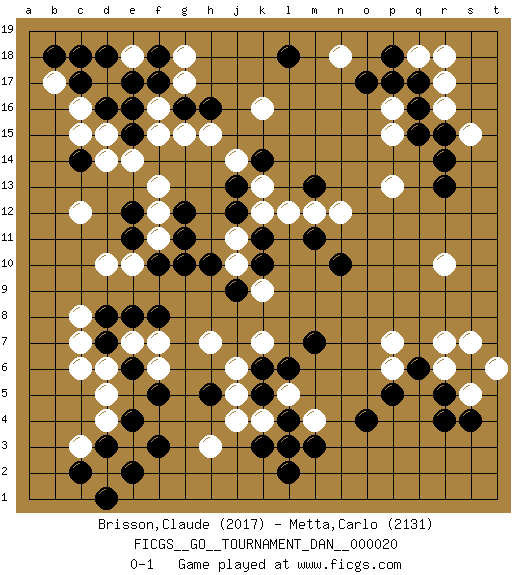 Last move : 0-1 2010 August 23 20:44:30 [Event "FICGS__GO__TOURNAMENT_DAN__000020"] [Site "FICGS"] [Date "2010.02.24"] [Round "1"] [Black "Brisson,Claude"] [White "Metta,Carlo"] [Result "0-1"] [Rating 1 "2017"] [Rating 2 "2131"] 1.q16 d4 2.r4 d17 3.f3 c6 4.m3 r10 5.r13 r7 6.q6 s5 7.s6 r6 8.r5 s7 9.s4 t6 10.o4 k16 11.c14 c12 12.c17 c16 13.d16 b17 14.c18 d15 15.e16 c15 16.b18 f15 17.e15 e14 18.e17 d14 19.g16 g15 20.h16 h15 21.f5 d2 22.e8 h3 23.e2 l3 24.l4 k4 25.l2 l5 26.k3 m4 27.l3 j4 28.k5 j6 29.k6 k7 30.l6 h7 31.f8 f6 32.e6 f7 33.e4 d5 34.d3 c3 35.c2 e3 36.h5 j5 37.d3 f16 38.d1 e18 39.f17 g17 40.f18 g18 41.d18 e7 42.e12 e10 43.f10 f11 44.e11 d10 45.g10 f12 46.k11 j10 47.g12 f13 48.g11 j11 49.j12 k12 50.j13 k13 51.d7 d6 52.k14 j14 53.k10 k9 54.m11 m12 55.j9 r17 56.q17 r16 57.r15 s15 58.r14 q18 59.p18 r18 60.o17 p15 61.q15 p13 62.l18 c8 63.d8 c7 64.h10 p16 65.p17 p6 66.p5 p7 67.m13 l12 68.n10 n12 69.m7 n18 0-1 Here are the names of the openings (joseki) played in the four corners : Corner d4 : d4 f3 Hoshi (Hwajeom, Seongjeom, Xingwei`) 4-4 Point. The star or hoshi (4-4) point, emphasizing influence at the potential expense of territory. Ikken Kakari (Hankan Keolch'im, Yi Gua`jiao~, 1-Space Low Approach). Black 2 is the standard approach move to the 4-4. Corner d16 : d17 c14 Komoku (Somok, Xiao~mu`) 3-4 Point. The komoku (3-4) point is the traditional corner enclosure move.. Niken Kakari (Dukan Keolch'im, E`r Gua`jiao~, 2-Space Low Approach). Black 2 is used with friendly forces backing it up. Its purpose is to prevent a pincer. Locally it results in a loss, but may be appropriate fuseki strategy. It was popular in the late 1950s and early 1960s, but is not seen often nowadays, having been replaced by the one-space high approach, with which it has points in common. Player White won this Go (weiqi, baduk) game. Follow this game move after move (download)There is no territory in the centre. (Anonymous) A cynic is a man who knows the price of everything but the value of nothing. (Oscar Wilde)