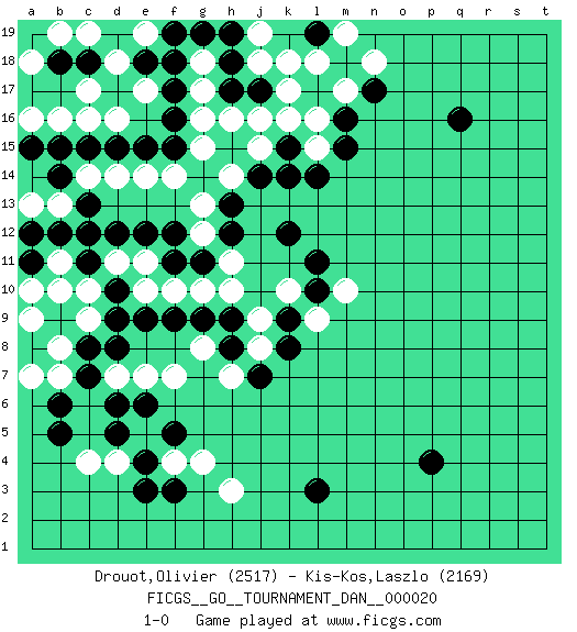 Last move : 1-0 2010 June 4 12:0:47 [Event "FICGS__GO__TOURNAMENT_DAN__000020"] [Site "FICGS"] [Date "2010.02.24"] [Round "1"] [Black "Drouot,Olivier"] [White "Kis-Kos,Laszlo"] [Result "1-0"] [Rating 1 "2517"] [Rating 2 "2169"] 1.q16 d4 2.p4 d16 3.f3 h3 4.l3 f4 5.f17 d14 6.c12 c9 7.e12 f14 8.e9 d11 9.d12 f10 10.d10 c10 11.c11 e11 12.c8 b8 13.d8 b7 14.f12 h10 15.f9 g10 16.b14 b16 17.h12 h7 18.e15 e14 19.j14 g16 20.h18 j16 21.d17 c17 22.d15 e17 23.f16 g15 24.c15 d18 25.k15 k16 26.m15 l16 27.m16 g17 28.f18 g18 29.g19 j18 30.h17 j15 31.k14 b13 32.c13 c14 33.b15 h14 34.h13 g13 35.f11 e10 36.j17 k18 37.m18 h16 38.f15 k17 39.h19 j19 40.f19 l18 41.l19 m17 42.n17 n18 43.l17 g12 44.g11 m17 45.e4 e5 46.l17 l15 47.l14 m17 48.e3 g4 49.l17 b11 50.b12 m17 51.d5 m19 52.d6 h11 53.k12 c4 54.f5 e7 55.e6 f7 56.b6 b10 57.b5 a9 58.d9 c16 59.a11 a7 60.a15 a13 61.h8 g8 62.g9 k10 63.a12 a10 64.h9 m10 65.b18 a16 66.l10 l9 67.d19 c19 68.c18 e19 69.e18 b19 70.d19 d7 71.c7 e19 72.l11 a18 73.k9 j9 74.k8 j8 75.j7 1-0 Here are the names of the openings (joseki) played in the four corners : Corner d4 : d4 f3 Hoshi (Hwajeom, Seongjeom, Xingwei`) 4-4 Point. The star or hoshi (4-4) point, emphasizing influence at the potential expense of territory. Ikken Kakari (Hankan Keolch'im, Yi Gua`jiao~, 1-Space Low Approach). Black 2 is the standard approach move to the 4-4. Corner d16 : d16 f17 Hoshi (Hwajeom, Seongjeom, Xingwei`) 4-4 Point. The star or hoshi (4-4) point, emphasizing influence at the potential expense of territory. Ikken Kakari (Hankan Keolch'im, Yi Gua`jiao~, 1-Space Low Approach). Black 2 is the standard approach move to the 4-4. Player Black won this Go (weiqi, baduk) game. Follow this game move after move (download)Extend one hand from the cutting points. (Anonymous) All the biggest technological inventions created by man - the airplane, the automobile, the computer - says little about his intelligence, but speaks volumes about his laziness. (Mark Kennedy)
