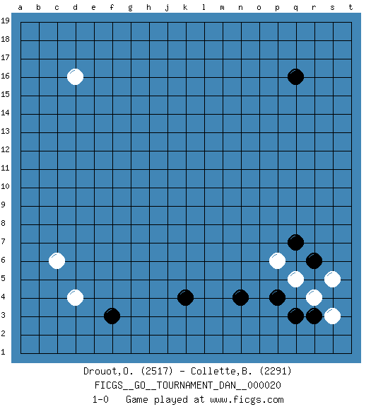 Last move : 1-0 2010 April 4 8:32:49 [Event "FICGS__GO__TOURNAMENT_DAN__000020"] [Site "FICGS"] [Date "2010.02.24"] [Round "1"] [Black "Drouot,Olivier"] [White "Collette,Benjamin"] [Result "1-0"] [Rating 1 "2517"] [Rating 2 "2291"] 1.q16 d4 2.p4 d16 3.f3 c6 4.k4 r4 5.r6 q5 6.r3 s3 7.q3 s5 8.q7 p6 9.n4 1-0 This go game has been lost on time (started : 2010.02.24 20:11:24) Here are the names of the openings (joseki) played in the four corners : Corner d4 : d4 f3 Hoshi (Hwajeom, Seongjeom, Xingwei`) 4-4 Point. The star or hoshi (4-4) point, emphasizing influence at the potential expense of territory. Ikken Kakari (Hankan Keolch'im, Yi Gua`jiao~, 1-Space Low Approach). Black 2 is the standard approach move to the 4-4. Corner q4 : p4 r4 Takamoku (Gomok, Gaomu`) 5-4 Point. The takamoku (high) point (5-4). With its emphasis on influence, the 5-4 point complements the 4-4 (hoshi) point in creating an influence-oriented fuseki. Komoku. Black responds with 3-3, 3-5, 4-6, 4-7, 3-6, 3-7. Player Black won this Go (weiqi, baduk) game. Follow this game move after move (download)For rectangular six in the corner, dame is necessary. (Anonymous) I take risks, sometimes patients die, but not taking risks causes more patients to die. So I guess my biggest problem is I've been cursed with the ability to do the math. (Gregory House, House M.D.)