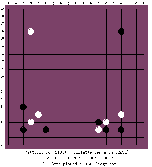 Last move : 1-0 2010 April 7 20:45:54 [Event "FICGS__GO__TOURNAMENT_DAN__000020 "] [Site "FICGS"] [Date "2010.02.24"] [Round "1"] [Black "Metta,Carlo "] [White "Collette,Benjamin "] [Result "1-0"] [Rating 1 "2131"] [Rating 2 "2291"] 1.q16 d4 2.q3 d16 3.f3 q5 4.c6 e5 5.c3 o4 6.o3 n3 7.n4 1-0 This go game has been lost on time (started : 2010.02.24 20:11:24) Here are the names of the openings (joseki) played in the four corners : Corner d4 : d4 f3Hoshi (Hwajeom, Seongjeom, Xingwei`) 4-4 Point. The star or hoshi (4-4) point, emphasizing influence at the potential expense of territory.Ikken Kakari (Hankan Keolch'im, Yi Gua`jiao~, 1-Space Low Approach). Black 2 is the standard approach move to the 4-4. Corner q4 : q3 q5Komoku (Somok, Xiao~mu`) 3-4 Point. The komoku (3-4) point is the traditional corner enclosure move..Ikken Takagakari (Hankan Nop'dakeolch'im, Yi Gaogua`jiao~, 1-Space High Approach). The 5-4 approach move has become more popular in modern times, as modern Go emphasizes speed and influence. Player Black won this Go (weiqi, baduk) game.Follow this game move after move (download ) A knight's move near the edge of the board cannot be cut. (Bill Taylor) Pretend inferiority and encourage his arrogance. (Sun Tzu)