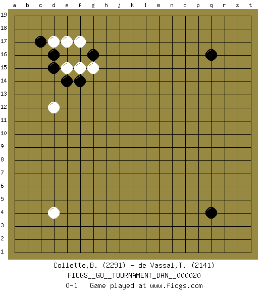 Last move : 0-1 2010 April 8 20:45:22 [Event "FICGS__GO__TOURNAMENT_DAN__000020"] [Site "FICGS"] [Date "2010.02.24"] [Round "1"] [Black "Collette,Benjamin"] [White "de Vassal,Thibault"] [Result "0-1"] [Rating 1 "2291"] [Rating 2 "2141"] 1.q16 d4 2.q4 d17 3.d15 d12 4.g16 e15 5.e14 f15 6.d16 f17 7.c17 e17 8.f14 g15 0-1 This go game has been lost on time (started : 2010.02.24 20:11:24) Here are the names of the openings (joseki) played in the four corners : Corner d16 : d17 d15 Komoku (Somok, Xiao~mu`) 3-4 Point. The komoku (3-4) point is the traditional corner enclosure move.. Ikken Takagakari (Hankan Nop'dakeolch'im, Yi Gaogua`jiao~, 1-Space High Approach). The 5-4 approach move has become more popular in modern times, as modern Go emphasizes speed and influence. Corner d4 : d4 0-1 Hoshi (Hwajeom, Seongjeom, Xingwei`) 4-4 Point. The star or hoshi (4-4) point, emphasizing influence at the potential expense of territory. Player White won this Go (weiqi, baduk) game. Follow this game move after move (download)The comb formation is alive. (Anonymous) Always remember that you are unique; just like everyone else. (Unknown)