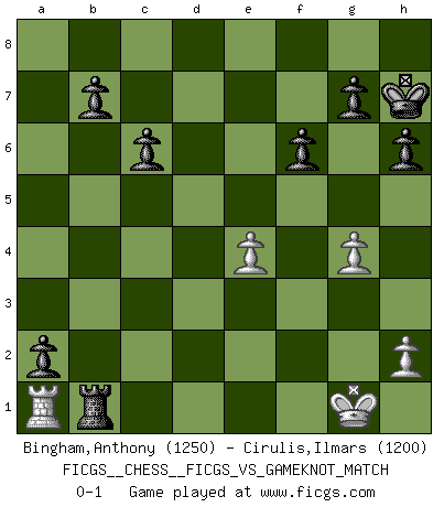 Last move : 0-1 2006 December 17 19:1:23 [Event "FICGS__CHESS__FICGS_VS_GAMEKNOT_MATCH"] [Site "FICGS"] [Date "2006.10.17"] [Round "1"] [White "Bingham,Anthony"] [Black "Cirulis,Ilmars"] [Result "0-1"] [WhiteElo "1250"] [BlackElo "1200"] 1.e4 e5 2.Nf3 Nc6 3.Bb5 Nf6 4.Nc3 Bb4 5.d4 exd4 6.a3 Bxc3+ 7.bxc3 dxc3 8.O-O O-O 9.Bg5 h6 10.Bxf6 Qxf6 11.Re1 a6 12.Bxc6 dxc6 13.Re3 Bg4 14.e5 Bxf3 15.Qxf3 Qxf3 16.Rxf3 Rfe8 17.Re1 Rad8 18.Rxc3 Rxe5 19.Rce3 Rxe3 20.fxe3 Rd2 21.c4 Rd3 22.a4 Rc3 23.Rd1 Rxc4 24.a5 Ra4 25.Rd7 Rxa5 26.Rxc7 Rb5 27.g4 a5 28.Rc8+ Kh7 29.Rc7 f6 30.e4 a4 31.Rd7 a3 32.Rd1 a2 33.Ra1 Rb1+ 0-1 Ruy Lopez : Berlin defense Kingside Castling by player White (move 8) Kingside Castling by player Black (move 8) Player Black won this chess game. Follow this game move after move (download)Up to this point White has been following well-known analysis. But now he makes a fatal error: he begins to use his own head. (Siegbert Tarrasch) Bis jetzt ist Weiß einer wohlbekannten Analyse gefolgt. Aber jetzt begeht er einen schrecklichen Fehler: Er beginnt seinen eigenen Kopf zu benutzen. (Siegbert Tarrasch) El Ajedrez es tan inspirador que yo no creo que un buen jugador sea capaz de tener un pensamiento malo durante una partida. (Wilhelm Steinitz) On n'a jamais que l'âge auquel on a commence à jouer aux échecs car après on cesse de vieillir. (Capablanca) A journey of a thousand sites begins with a single click. (Author unknown)
