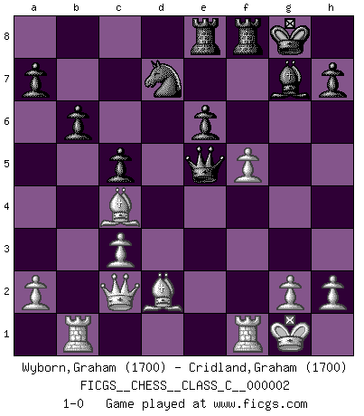 Last move : 1-0 2006 July 5 23:50:40 [Event "FICGS__CHESS__CLASS_C__000002"] [Site "FICGS"] [Date "2006.04.26"] [Round "1"] [White "Wyborn,Graham"] [Black "Cridland,Graham"] [Result "1-0"] [WhiteElo "1700"] [BlackElo "1700"] 1.d4 Nf6 2.c4 g6 3.Nf3 Bg7 4.Nc3 d5 5.cxd5 Nxd5 6.e4 Nxc3 7.bxc3 O-O 8.Be2 c5 9.O-O Nc6 10.Be3 Bg4 11.d5 Bxf3 12.Bxf3 Ne5 13.Be2 Nd7 14.Rb1 b6 15.Qc2 Qc7 16.f4 e6 17.dxe6 fxe6 18.Bc4 Rae8 19.f5 gxf5 20.exf5 Qe5 21.Bd2 1-0 King's Indian, 3.Nf3 Kingside Castling by player Black (move 7) Kingside Castling by player White (move 9) Player White won this chess game. Follow this game move after move (download)Help your pieces so they can help you. (Paul Morphy) Ich tröste mich mit dem Vergnügen, daß Schachfans, Zuschauer und Leser glücklich sind, wenn ein Großmeister etwas riskiert, statt nur Klötzchen zu schieben. (Mikhail Nekhemyevich Tal) En partidas rápidas, el Caballo es mas poderoso que el Alfil. (Vlastimil Hort) C'est une question de caractère, Beaucoup de gens perdent leur motivation très vite. D'autres, ils sont rares, peuvent la conserver très longtemps. J'aime les échecs, encore aujourd'hui je suis heureux d'analyser des parties. J'aime toujours gagner, je déteste encore perdre. Bien jouer est important pour mon intégrité intellectuelle et morale. Et puis les échecs vivent en ce moment une période historique grâce à Internet. Ils se développent dans les systèmes éducatifs à travers le monde. Ils sortent de leur ghetto, et c'est mon rôle de mener à bien cette révolution. (Gary Kasparov) Rules and bones are meant to be broken. (Anonymous)