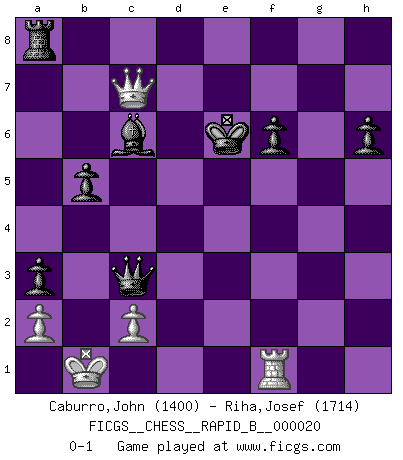 Last move : 0-1 2006 October 25 16:20:38 [Event "FICGS__CHESS__RAPID_B__000020"] [Site "FICGS"] [Date "2006.10.17"] [Round "1"] [White "Caburro,John"] [Black "Riha,Josef"] [Result "0-1"] [WhiteElo "1400"] [BlackElo "1714"] 1.e4 c5 2.Nf3 Nc6 3.d4 cxd4 4.Nxd4 Nf6 5.Nc3 d6 6.Bg5 e6 7.Qd2 Be7 8.O-O-O O-O 9.f4 Nxd4 10.Qxd4 Qa5 11.Bc4 Bd7 12.Bb3 Bc6 13.Rhe1 Rfe8 14.Kb1 h6 15.Bh4 Nxe4 16.Bxe7 Nxc3+ 17.bxc3 Rxe7 18.Qxd6 Rd7 19.Qb4 Rxd1+ 20.Rxd1 Qh5 21.Rd2 Qxh2 22.Qd4 a5 23.f5 exf5 24.g4 Qh3 25.gxf5 a4 26.Bc4 b5 27.Bxf7+ Kxf7 28.Qd6 a3 29.f6 gxf6 30.Qc7+ Kg6 31.Rd1 Qxc3 32.Rg1+ Kf5 33.Rf1+ Ke6 0-1 Sicilian defense Queenside Castling by player White (move 8) Kingside Castling by player Black (move 8) Player Black won this chess game. Follow this game move after move (download)When I asked Fischer why he had not played a certain move in our game, he replied: 'Well, you laughed when I wrote it down !' (Mikhail Tal) Ich glaube nicht an Psychologie, ich glaube an gute Züge. (Robert James Fischer) Cuando no sepas que mover, espera por una idea que se le venga a la la cabeza de tu oponente. Tenlo por seguro de que esa idea estará incorrecta. (Siegbert Tarrasch) La menace est plus forte que l'exécution. (Aaron Nimzovitch) There is a computer disease that anybody who works with computers knows about. It's a very serious disease and it interferes completely with the work. The trouble with computers is that you 'play' with them ! (Richard P. Feynman)