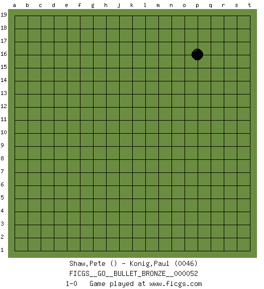 Last move : 1-0 2010 February 26 4:3:44 [Event "FICGS__GO__BULLET_BRONZE__000052"] [Site "FICGS"] [Date "2010.02.26"] [Round "1"] [Black "Shaw,Pete"] [White "Konig,Paul"] [Result "1-0"] [Rating 2 "0046"] 1.p16 1-0 This go game has been lost on time (started : 2010.02.26 3:12:54) Here are the names of the openings (joseki) played in the four corners : Player Black won this Go (weiqi, baduk) game. Follow this game move after move (download)More haste less speed. (John Fairbairn) Art disturbs, science reassures. (Georges Braque, Le Jour et la Nuit)
