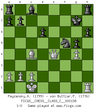 Last move : 1-0 2010 May 27 8:35:16 [Event "FICGS__CHESS__CLASS_C__000138"] [Site "FICGS"] [Date "2010.02.26"] [Round "1"] [White "Payzansky,Aleksey"] [Black "von Buttlar,Paul"] [Result "1-0"] [WhiteElo "1799"] [BlackElo "1776"] 1.e4 e6 2.d4 d5 3.Nc3 Nf6 4.Bg5 Be7 5.e5 Nfd7 6.h4 Bxg5 7.hxg5 Qxg5 8.Nh3 Qe7 9.Nf4 Nc6 10.Qg4 Nxd4 11.O-O-O Nf5 12.Nfxd5 exd5 13.Nxd5 Nxe5 14.Qe2 Qd6 15.f4 f6 16.fxe5 fxe5 17.Qh5+ g6 18.Qg5 Kf7 19.Nf4 exf4 20.Bc4+ Kg7 21.Rxd6 cxd6 22.g4 h6 23.Qxf4 g5 24.Qe4 1-0 French : Albin-Alekhine-Chatard attack Queenside Castling by player White (move 11) Player White won this chess game. Follow this game move after move (download)I am still a victim of Chess. It has all the beauty of art and much more. It cannot be commercialized. Chess is much purer than art in its social position. (Marcel Duchamp) Ich glaube, ich kenne inzwischen die Gründe für mein Versagen: schachliche Charakterfehler. Ich war nie ein Wunderkind und in meiner gesamten menschlichen Entwicklung immer zu langsam. (Viktor Kortschnoi) El Ajedrez es una guerra en un tablero. El objetivo es aplastar la mente del oponente. (Bobby Fischer) La victoire dans une partie d'Echecs appartient la plupart du temps à celui qui voit un peu plus loin que l'adversaire. (Lasker) The worth of a book is to be measured by what you can carry away from it. (James Bryce)