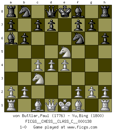 Last move : 1-0 2010 April 15 20:57:24 [Event "FICGS__CHESS__CLASS_C__000138"] [Site "FICGS"] [Date "2010.02.26"] [Round "1"] [White "von Buttlar,Paul"] [Black "Yu,Bing"] [Result "1-0"] [WhiteElo "1776"] [BlackElo "1800"] 1.c4 e5 2.Nc3 Nf6 3.Nf3 h6 4.Nxe5 b6 5.d4 Ba6 6.e4 1-0 This chess game has been lost on time (started : 2010.02.26 9:35:32) English Opening Player White won this chess game. Follow this game move after move (download)Adequate compensation for a sacrifice is having a sound combination leading to a winning position; adequate compensation for a blunder is having your opponent snatch defeat from the jaws of victory. (Bruce A. Moon) Ich kenne keine einzige Person, die behaupten würde, Garri Kasparow sei ein guter Mensch (Nigel Short) La captura del Rey enemigo es la finalidad pero no el primer objetivo de la partida. (William Steinitz) Le jeu d'échecs est comme rejeté hors du temps. (Antoine de Saint-Exupéry) Either move or be moved. (Ezra Pound)