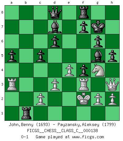 Last move : 0-1 2010 June 5 13:19:16 [Event "FICGS__CHESS__CLASS_C__000138"] [Site "FICGS"] [Date "2010.02.26"] [Round "1"] [White "John,Benny"] [Black "Payzansky,Aleksey"] [Result "0-1"] [WhiteElo "1693"] [BlackElo "1799"] 1.e4 c5 2.Bc4 Nc6 3.Nf3 d6 4.Bb5 Bd7 5.Bxc6 Bxc6 6.Nc3 Nf6 7.d3 g6 8.O-O Bg7 9.Be3 O-O 10.Re1 Ng4 11.Ng5 Nxe3 12.Rxe3 b5 13.a3 a5 14.Qf3 b4 15.Nd1 Bh6 16.Qg4 e5 17.Rg3 Bd7 18.Qh4 Kg7 19.Ne3 bxa3 20.Rxa3 Rb8 21.Ng4 Bxg5 22.Qh3 Rxb2 23.f4 Rb1+ 24.Kf2 exf4 25.Rf3 h5 0-1 Sicilian defense Kingside Castling by player White (move 8) Kingside Castling by player Black (move 9) Player Black won this chess game. Follow this game move after move (download)It began to feel as though you were playing against Chess itself. - On playing against Robert Fischer. (Walter Shipman) Nach Morphy wurde nichts neues mehr in der Behandlung offener Positionen gefunden. (Mikhail Moiseyevich Botvinik) El Ajedrez es un expediente tonto que hace creer a la gente inactiva que hacen una cosa muy astuta cuando solamente estan perdiendo su tiempo. (George Bernard Shaw) Vous m'avez demandé de vous exposer quel est le fondement de la prière. Je ne fais que préparer les pièces du jeu sur la table... Nous sera-t-il permis d'en adopter les règles et si nous les appliquons scrupuleusement nous ne tarderons pas à faire mat le Roi divin ! Il ne pourra échapper à nos mains. (Sainte Thérèse d'Avila, Chemin de perfection) Always remember that you are unique; just like everyone else. (Unknown)