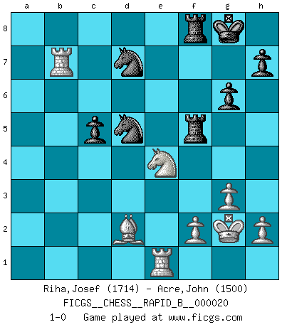 Last move : 1-0 2006 November 6 23:17:2 [Event "FICGS__CHESS__RAPID_B__000020"] [Site "FICGS"] [Date "2006.10.17"] [Round "1"] [White "Riha,Josef"] [Black "Acre,John"] [Result "1-0"] [WhiteElo "1714"] [BlackElo "1500"] 1.d4 Nf6 2.c4 c5 3.d5 b5 4.cxb5 a6 5.bxa6 g6 6.Nc3 Bxa6 7.e4 Bxf1 8.Kxf1 d6 9.g3 Bg7 10.Kg2 O-O 11.Nf3 Nbd7 12.Re1 Nb6 13.a4 Ra6 14.Bd2 Qa8 15.b3 Nfd7 16.Qe2 Qb7 17.Rac1 R6a8 18.Qe3 f5 19.a5 Rxa5 20.exf5 Rxf5 21.Qxe7 Ra8 22.Qe6+ Kh8 23.Ne4 Qxd5 24.Qxd6 Qxb3 25.Nfg5 Qd5 26.Ne6 Bf8 27.Qxd5 Nxd5 28.Nxf8 Raxf8 29.Rb1 Kg8 30.Rb7 1-0 Benko gambit accepted Kingside Castling by player Black (move 10) Player White won this chess game. Follow this game move after move (download)Everything is in a state of flux, and this includes the world of Chess. (Mikhail Botvinnik) Es hat in meinem Leben Zeiten gegeben, da ich sehr nahe daran war zu glauben, daß ich auch nicht eine einzige Schachpartie verlieren könnte. (José Raúl Capablanca) Estaba muy claro de que el punto vulnerable del Gran Maestro Americano (Bobby Fischer) radicaba en las posiciones de doble filo, colgantes, irracionales, donde el siempre falló en encontrar un triunfo aún en una posición de clara victoria. (Efim Geller) Le joueur d'Echecs qui veut atteindre le top est obligé de développer son propre credo créatif. Alexeï Stepanovicth Souétine. Il est facile d'écrire des livres ! Ce qui est difficile, c'est de jouer ! (Alexeï Stepanovicth Souétine) A government big enough to give you everything you want is strong enough to take everything you have. (Thomas Jefferson)