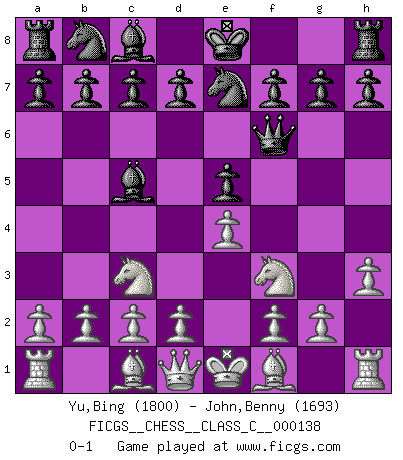 Last move : 0-1 2010 April 20 21:18:11 [Event "FICGS__CHESS__CLASS_C__000138"] [Site "FICGS"] [Date "2010.02.26"] [Round "1"] [White "Yu,Bing"] [Black "John,Benny"] [Result "0-1"] [WhiteElo "1800"] [BlackElo "1693"] 1.e4 e5 2.Nf3 Qf6 3.Nc3 Bc5 4.h3 Ne7 0-1 This chess game has been lost on time (started : 2010.02.26 9:35:32) Greco defense Player Black won this chess game. Follow this game move after move (download)With or without the title, Bobby Fischer was unquestionably the greatest player of his time. (Burt Hochberg) Im Schach gewinnt jeder. Hat man Freunde am Spiel - und das ist die Hauptsache - ist auch der Verlust einer Partie kein Unglück. (David Bronstein) En manos de Fischer's, una diminuta ventaja teórica es tan buena como tener una Reina de ventaja. (Isaac Kashdan) La guerre est enfant de la passion, la passion est enfant du narcissisme et le narcissisme est l'enfant. (...) Une autre partie ? (Thibault de Vassal) When the going gets tactical, the computers get going. (Hyatt)