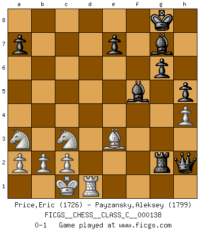 Last move : 0-1 2010 May 3 19:11:14 [Event "FICGS__CHESS__CLASS_C__000138"] [Site "FICGS"] [Date "2010.02.26"] [Round "1"] [White "Price,Eric"] [Black "Payzansky,Aleksey"] [Result "0-1"] [WhiteElo "1726"] [BlackElo "1799"] 1.e4 c5 2.Nf3 d6 3.d4 cxd4 4.Nxd4 Nf6 5.Nc3 g6 6.Be3 Bg7 7.f3 O-O 8.Bc4 Nc6 9.Qd2 Bd7 10.O-O-O Rc8 11.Bb3 Ne5 12.h4 h5 13.Bg5 Rc5 14.f4 Nc4 15.Qd3 b5 16.e5 Ng4 17.Ndxb5 Nf2 18.Qe2 Nxd1 19.Bxc4 Bg4 20.Qf1 Ne3 21.Bxf7+ Rxf7 22.Qf2 Rxe5 23.fxe5 Rxf2 24.Bxe3 Rxg2 25.exd6 Bf5 26.Na3 Qxd6 27.Rd1 Qh2 0-1 Sicilian : Dragon, Yugoslav attack, 7...O-O Kingside Castling by player Black (move 7) Queenside Castling by player White (move 10) Player Black won this chess game. Follow this game move after move (download)Personally, I rather look forward to a computer program winning the world Chess Championship. Humanity needs a lesson in humility. (Richard Dawkings) Im Internet Chess Club betrug mein Rating vorübergehend 3350 ELO-Punkte. (Sergej Karjakin) Para mi, el Ajedrez es la vida y cada partida es como una nueva vida. Todo jugador de Ajedrez suele vivir muchas vidas durante su vida. (Eduard Gufeld) Les Echecs ont trois composantes : le temps, l'espace et le matériel en dernier. (Mikhail Tal) Luck is what you have left over after you give 100 percent. (Langston Coleman)